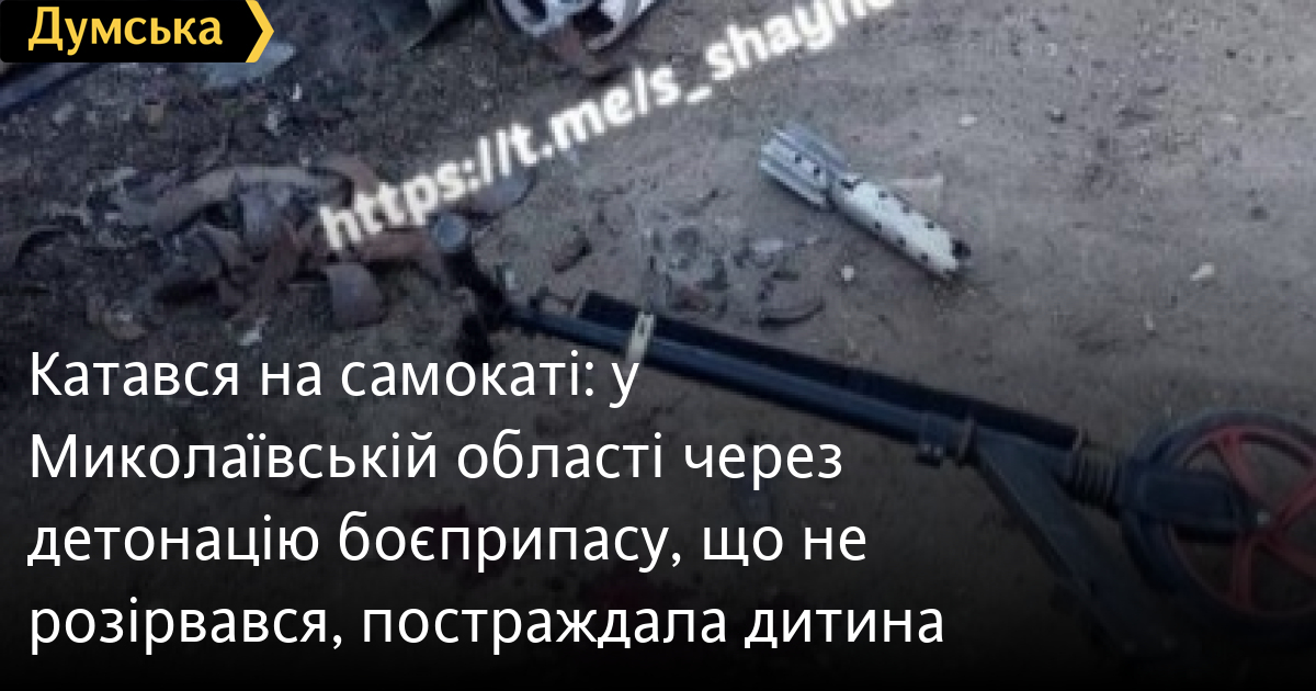 Катався на самокаті: у Миколаївській області через детонацію боєприпасу, що не розірвався, постраждала дитина9-річний хлопчик постраждав унаслідок детонації знайденого на городі боєприпасу, що не розірвався, у Миколаївській області. Про це повідомив голова головного управління Нацполіції в Миколаївській області Сергій Шайхет. За його словами, мешканець села Лимани, що під Миколаєвом, знайшов на своєму городі касетний снаряд, який не розірвався, приніс його і залишив на подвір'ї, а сам пішов у справах. У цей час у дворі на самокаті катався дев'ятирічний хлопчик. «Снаряд здетонував, дитина отримала осколкові поранення. Наразі хлопчика доправили до лікарні. За його життя борються медики», — зазначив він. Сергій Шайхет нагадав, що в тих районах, де велися активні бойові дії та які були під окупацією, дуже багато небезпечних знахідок, і закликав мешканців бути максимально обережними, не торкатися знайдених предметів, оскільки вони можуть бути смертельно небезпечними. СМЕРТЬ РОСІЙСЬКИМ ОКУПАНТАМ! Помітили помилку? Виділяйте слова з помилкою та натискайте control-enter |