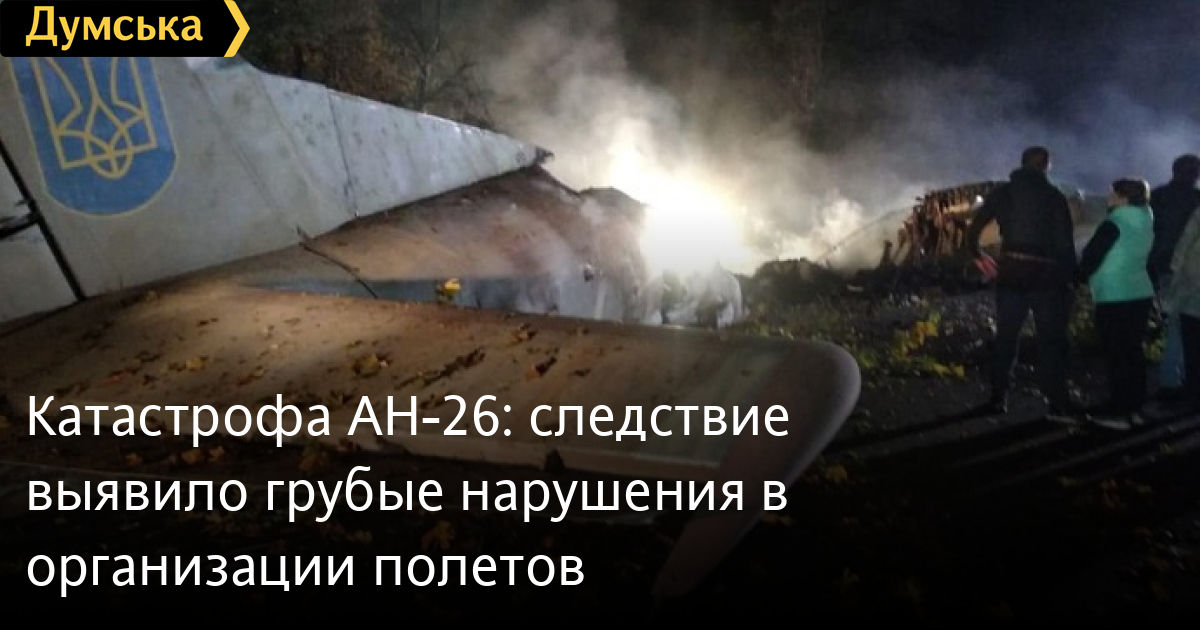 Следствие по делу о катастрофе АН-26 под Чугуевом Харьковской области выявило грубые нарушения в исполнении полетных заданий и в целом в организации полетов. Об этом сообщил глава правительственной комиссии по расследованию катастрофы АН-26, вице-премьер — министр по вопросам стратегических отраслей промышленности Олег Уруский в Фейсбук. Он отметил, что благодаря расшифровке бортовых самописцев был полностью восстановлен трагический полет. Также установлено содержание переговоров, как между членами экипажа, так и с руководством полетов. «Установлена техническая причина нештатной работы левого двигателя и срабатывания датчика падения давления по «ИКМ» (измеритель крутящего момента). Это произошло в результате отказа в работе одного из блоков системы управления двигателя», — подчеркнул Уруский. Он также сообщил, что компенсации семья погибших начнут выплачивать после 15 октября. «Министерство обороны Украины завершит собственное служебное расследование 12 октября 2020. После чего материалы будут переданы в военные комиссариаты и, ориентировочно, после 15 октября 2020 ожидается начало процесса выплат компенсаций семьям погибших», — уточнил глава правительственной комиссии. На компенсации будет выделено в общей сложности 1,5 млн гривен. Напомним, трагедия с самолетом АН-26 произошла 25 сентября. Из 27 человек, которые находились на борту, только одному удалось выжить. Среди погибших 19 курсантов и семь офицеров. Вчера в Харькове состоялась церемония прощания с жертвами катастрофы. СМЕРТЬ РОСІЙСЬКИМ ОКУПАНТАМ! Помітили помилку? Виділяйте слова з помилкою та натискайте control-enter |