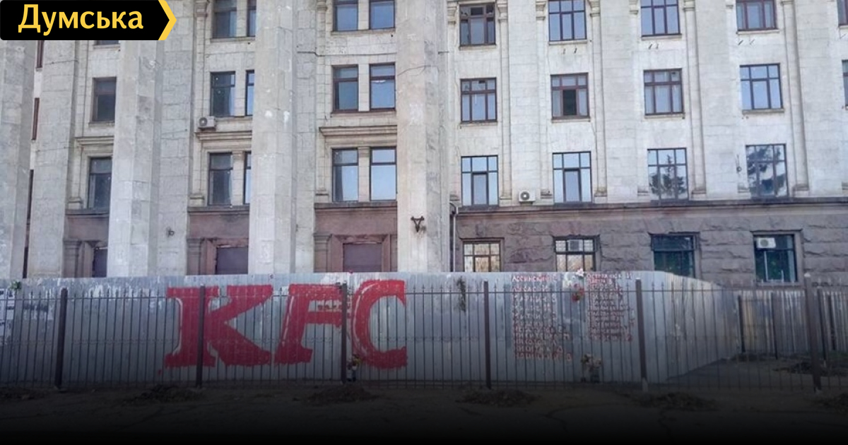 Логотип сети американских ресторанов быстрого питания KFC появился на временном заборе из профнастила, окружающем Дом профсоюзов на Куликовом поле Одессы.