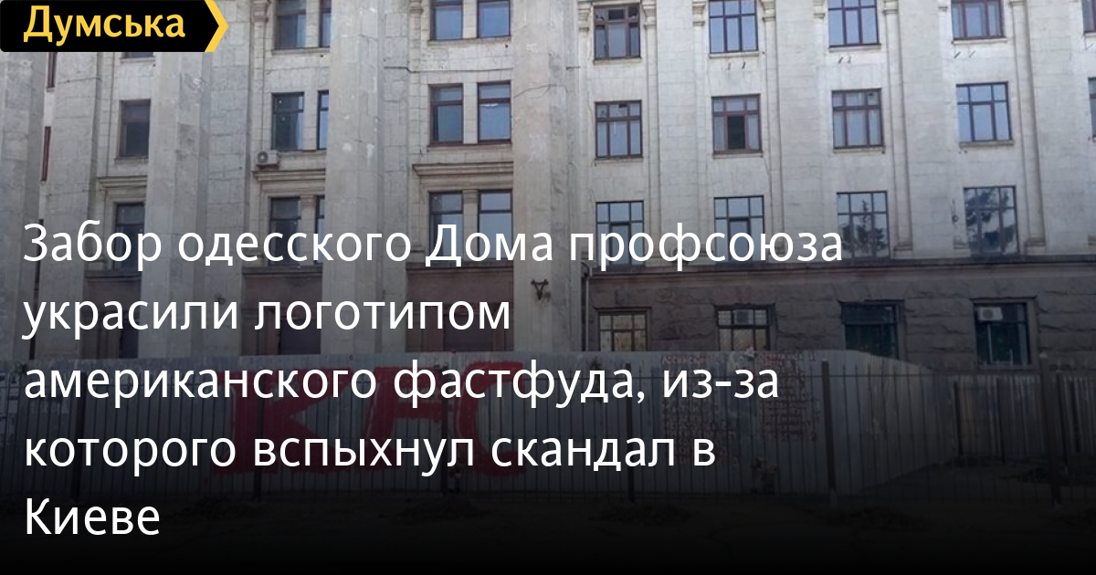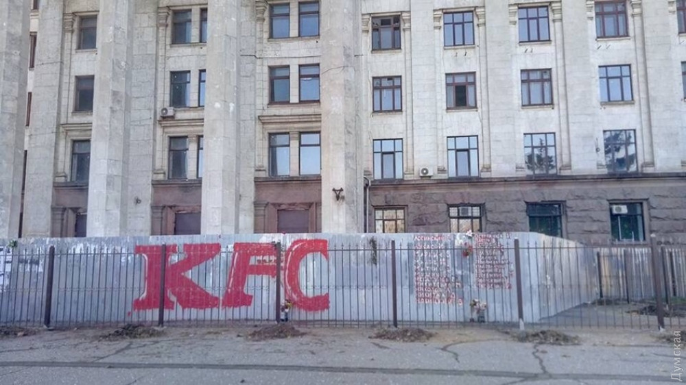 Логотип сети американских ресторанов быстрого питания KFC появился на временном заборе из профнастила, окружающем Дом профсоюзов на Куликовом поле Одессы.