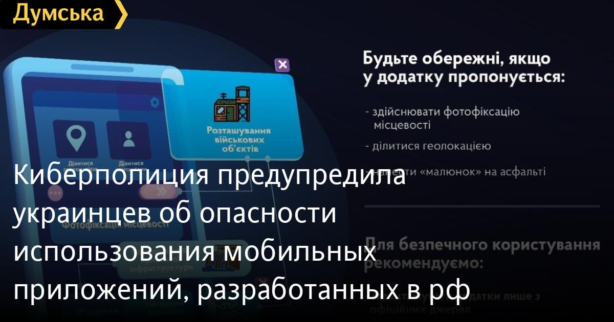 Кіберполіція попередила українців про небезпеку використання мобільних додатків, розроблених в рфКіберполіція попередила українців про те, що росія веде розвідку через мобільні додатки і закликала громадян бути обережнішими в інтернеті. У пресслужбі Кіберполіції зазначили, що в мережі поширюються мобільні програми, розроблені спецслужбами росії. Окупанти у формі гри намагаються дізнатися від українців інформацію про інфраструктуру, розташування позицій військових та схиляють до співпраці. У відомстві зазначили, що користувачів мають насамперед насторожити додатки, в яких необхідно фотографувати місцевість, ділитися геолокацією та наносити «малюнки» на асфальті. Для безпечного користування поліція рекомендувала завантажувати програми лише з офіційних джерел та перевірити всі доступні дані, такі як інформація про розробників, доступи, які додаток вимагає під час встановлення, відгуки користувачів. СМЕРТЬ РОСІЙСЬКИМ ОКУПАНТАМ! Помітили помилку? Виділяйте слова з помилкою та натискайте control-enter |