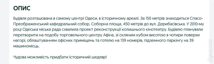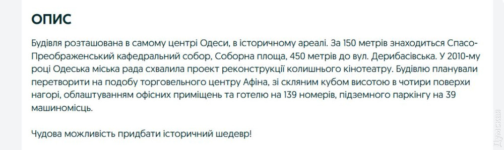 Зберегти «Одесу»: в серці міста руйнуєтся історична будівля алкогольних магнатів, а рятують її на паперіБудівлю легендарного кінотеатру «Одеса» на Спиридонівській, яка роками стоїть у занедбаному стані, намагаються рятувати — поки що на папері. Київський окружний адміністративний суд зобов’язав власника ТОВ «Технобуд Новий» укласти охоронний договір із Департаментом культури Одеської ОДА, повідомляє кореспондент «Думської». До кінця листопада фірма має підписати документ, який визначить правила догляду за історичною будівлею. «Одеса» перебуває під державною охороною ще з 1987 року. Сьогодні вона у критичному стані: фасади вкриті тріщинами, балкони обвалюються, частково вибито вікна. Контролюючі органи неодноразово фіксували порушення, а у 2021 році власника штрафували на 170 тисяч гривень за неналежне утримання пам’ятки. Однак з того часу його стан лише погіршився. Як з'ясувала «Думська», власник може навіть втратити свою нерухомість, яку він хотів переробити під торговий центр з готелем і надбудовою скляного куба в чотири поверхи. Зараз він продає її за 3 млн доларів. Відзначимо, що 10 років тому власник хотів виручити від продажу 10 млн доларів. «Відсутність договору не звільняє власника від відповідальності. Він зобов'язаний утримувати будівлю так, щоб вона не погіршилася і не зруйнувалася. Є юридичні інструменти впливати на таких непорядних власників. Якщо він не доглядає за нею або своєю бездіяльністю створює ризик її руйнування, держава має право втрутитися», — пояснює «Думській» юристка Анастасія Кузнєцова. За її словами, закон передбачає можливість примусового відчуження (викупу) пам'ятки у власника у випадку систематичного порушення охоронного законодавства. Цей процес юридично складний, тривалий і вимагає обов'язкової виплати ринкової компенсації. Спочатку орган охорони культурної спадщини (наприклад, департамент культури чи мінкульт) надсилає офіційне попередження власнику — із вимогою усунути порушення та забезпечити належний стан об’єкта. Якщо після цього власник не вживає жодних заходів, орган може звернутися до суду з позовом про викуп пам’ятки. Тобто держава може забрати об’єкт у власника, виплативши компенсацію, визначену за згодою сторін або рішенням суду. Іншими словами: якщо власник роками занедбує історичну будівлю, держава має право забрати її через суд, щоб урятувати культурну спадщину. ТОВ «Технобуд Новий» — компанія з київською пропискою. Вона належить Святославу Нечитайло. За даними аналітичної системи YouControl, фірма входить в так звану групу «Баядера». Це — алкогольний холдинг Східної Європи, об'єднує дистрибуторські компанії і три власні виробничі майданчики. Холдинг володіє великим портфелем власних алкогольних брендів (Хлібний дар, Koblevo, Перша гільдія, тощо), а також є ексклюзивним імпортером найвідоміших світових алкогольних компаній — Moët Hennessy, Mast Jägermeister, Peter Mertes, Anora, Maspex Group та інших. Також Святослав Нечитайло є власником мережі супермаркетів «ЕКО маркет». Будівля на Спиридонівській 1/3 була побудована в 1908-1909 роках за проєктом військового архітектора Тимофія Янчиса. Спочатку тут розташовувалося економічне товариство офіцерів Одеського округу і гарнізонне зібрання. У будинку була бібліотека з читальним залом, де влаштовувалися лекції, розбір тактичних завдань, військові ігр
