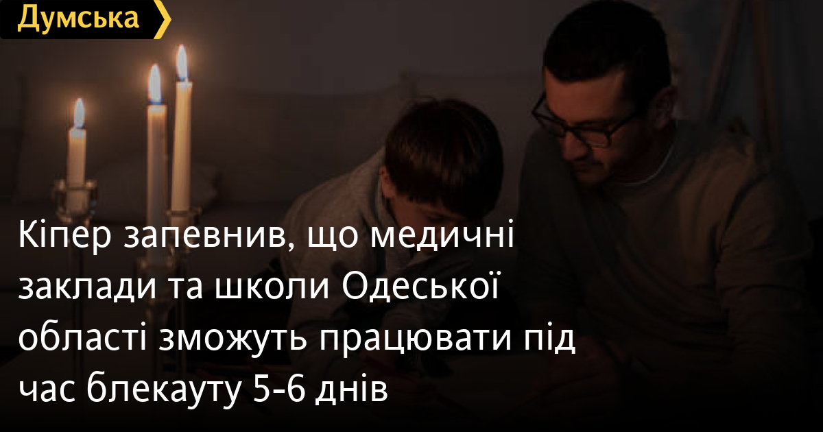 Кіпер запевнив, що медичні заклади та школи Одеської області зможуть працювати під час блекауту 5-6 днівШколи, дитячі садки та медичні заклади Одеської області на 100% готові до майбутньої зими. Як повідомив голова ОВА Олег Кіпер, вони забезпечені всім необхідним на випадок блекаутів. «У нас вже є досвід відключень світла взимку і ми готувалися до цього. Зараз підготовлено запас палива на п'ять-шість днів, щоб у разі блекауту установи могли функціонувати. Також опрацьовуємо можливість збільшення цього терміну, не п'ять-шість, а більше», — зазначив керівник області. Він додав, що влада вживає певних заходів, які він не хотів би виносити на загал. «Ми розуміємо, що цієї зими легко точно не буде, але готуємося до всього», — резюмував Кіпер. Нещодавно «Думська» писала, яким буде опалювальний сезон 2025-26 для Одеси і які випробування чекають на городян. А також ми склали гайд по виживанню взимку без тепла і світла. СМЕРТЬ РОСІЙСЬКИМ ОКУПАНТАМ! Помітили помилку? Виділяйте слова з помилкою та натискайте control-enter