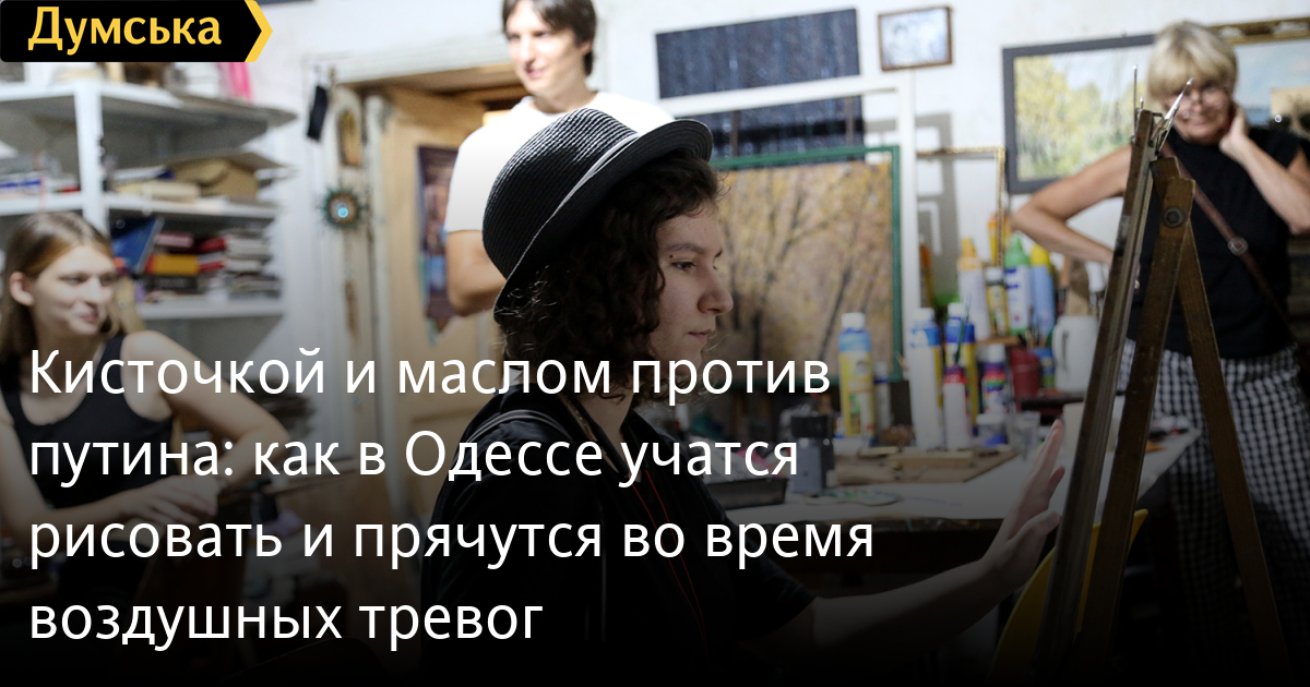 Пензликом та олією проти путіна: як в Одесі вчаться малювати і ховаються під час повітряних тривогМаленькі майстерні у напівпідвалі у самому центрі Одеси. Колись їх роздавали від Спілки художників, зараз усе тримається на чесному слові та за старою пам'яттю. Саме тут побувала кореспондент «Думської», щоби переконатися, що навіть під час війни творче життя у місті триває, незважаючи на повітряні тривоги. Тут знаходиться майстерня одразу двох одеських художників Ігоря Божка та його сина Сергія. Обидва — відомі автори, у кожного є свої шанувальники та шанувальниці. Ігор пережив Другу світову війну дитиною та добре її пам'ятає. Закінчив нашу Греківку ще в середині 1960-х, і вже тоді писав нонконформістські роботи та приймав активну участь у неформальних рухах. Пише вірші та талановиті картини, робить колажі та інсталяції. Частина робіт Ігоря Божка перебувають у його майстерні – вони надихають тих, хто приходить. Сергій – його син та учень. Після початку повномасштабного вторгнення повернувся до творчості в середині березня. «Пройшов перший шок і я зрозумів, що не можу не малювати — треба було висловитися хоч пензликом по полотну», — сміється Сергій. Одна з робіт молодого художника «Зацвіли вишні» — на полотні справді цвітуть дерева, але в об'єктив відеокамери безпілотника видно не лише їх, а зруйноване місто — розбиті будинки та знищена техніка ворога з літерами z та v. «Це була рефлексія на новини, на те, що відбувалося навколо. Перше усвідомлення — якого біса вони сунулися до нас, на нашу землю і полізли все руйнувати, красти та ґвалтувати», — розповідає Божко-молодший. А потім був один із прильотів до Одеси, і від ударної хвилі в картину «Дотримуйтесь спокою. Працює ППО» потрапили пензлики, пробили полотно і так там і залишилися. «Я написав про цей випадок на Фейсбуці і виклав фото. Спочатку хотів витягнути і залишити роботу з дірками — як символ війни. Мовляв, і картини зазнають поранень. Але потім вирішив, що нехай буде так, як трапилося, — ділиться художник. — А потім цю картину і купили. Соцмережі — найкращий маркетолог, зараз художникам не дуже солодко доводиться, адже потрібніше купувати дрони та тепловізори для наших захисників, а не живопис та графіку». На полотні «Перші підхерсоновики» — троє російських нацистів у окопі зі вкраденим холодильником та недоїденими кавунами. Цю картину Сергій закінчив незадовго до початку контрнаступу на півдні України. Автор поєднує майстерність живописця з тонкою іронією — це він прищеплює і своїм учням. «Взагалі-то школа-студія «Штрих» у нас працює ще з 2008 року, — розповідає Божко-молодший. — Ми одні з перших почали приймати учнів. Вчимо як академічному живопису, так і вільної творчості. Немає жодних догм, є бажання бачити і втілювати прекрасне — приходь і навчайся. Я взагалі проти догм, хоча й академізм у нас виходить непогано — після наших курсів усі вступали до вузів та до Греківки, жодних нещасних випадків не було. Усі задоволені та займаються творчістю». Студія відновила свою роботу теж з середини березня – двічі на тиждень, вечорами дівчатка та хлопчики, а також дорослі люди навчаються малюнку та живопису. Зараз немає фіксованої оплати – поклади у банку, скільки зможеш – тому що війна. «До мене прийшла родина з окупованого селища під Донецьком. Я говорю — я з вас грошей не візьму. 