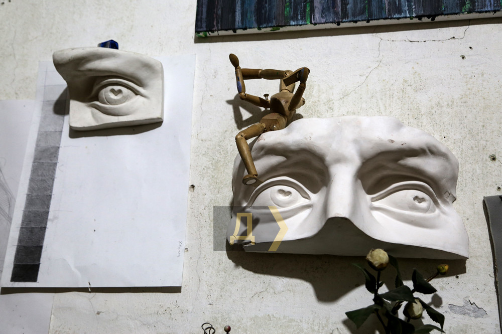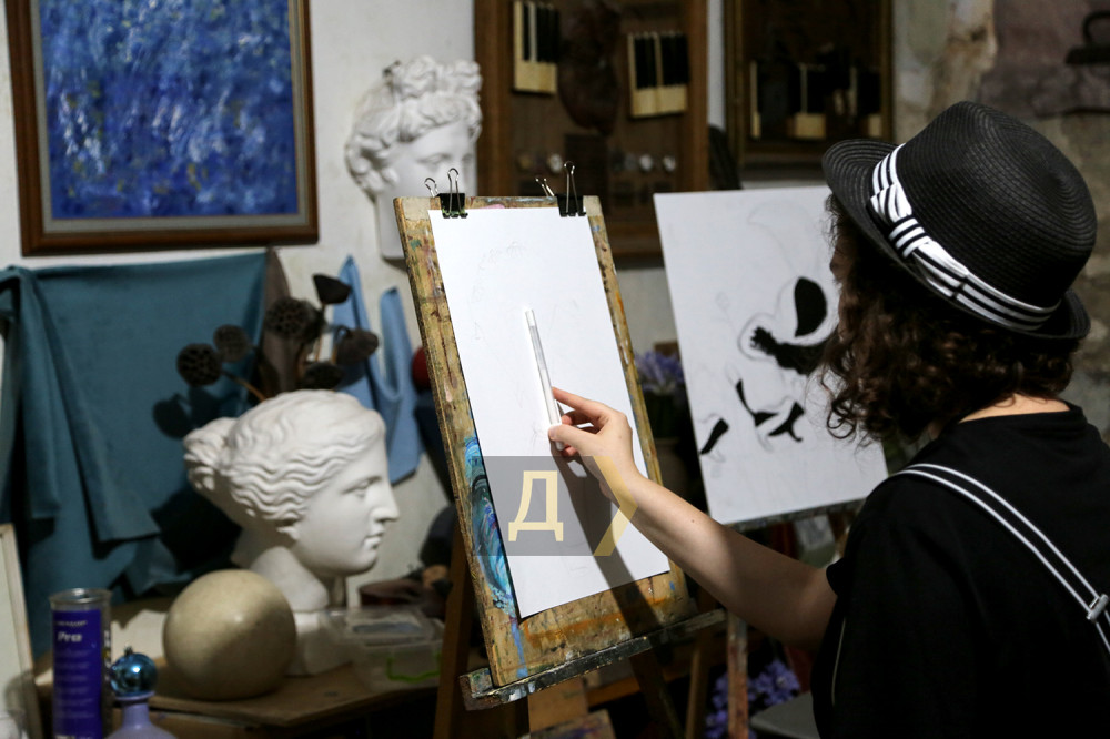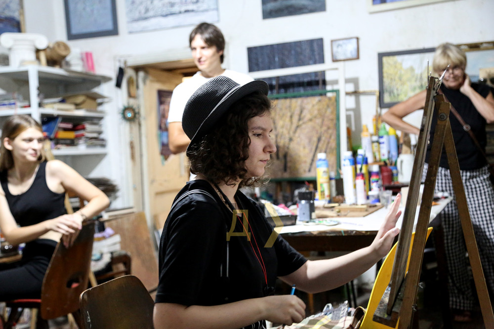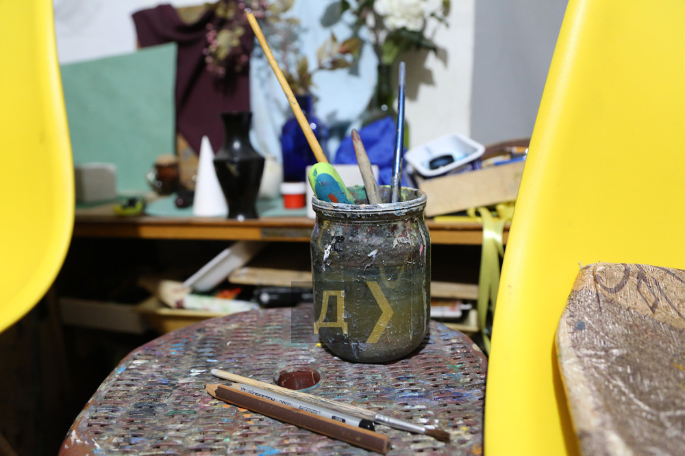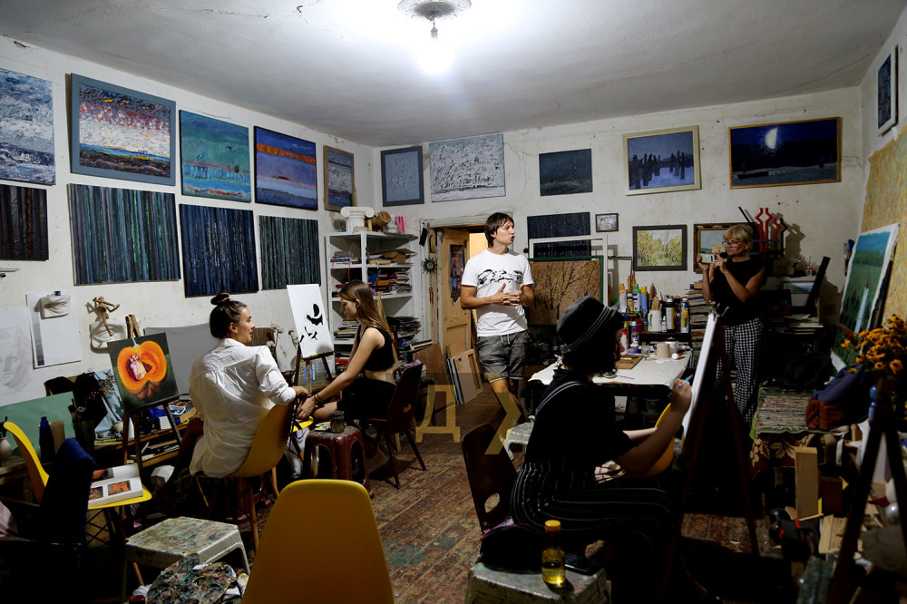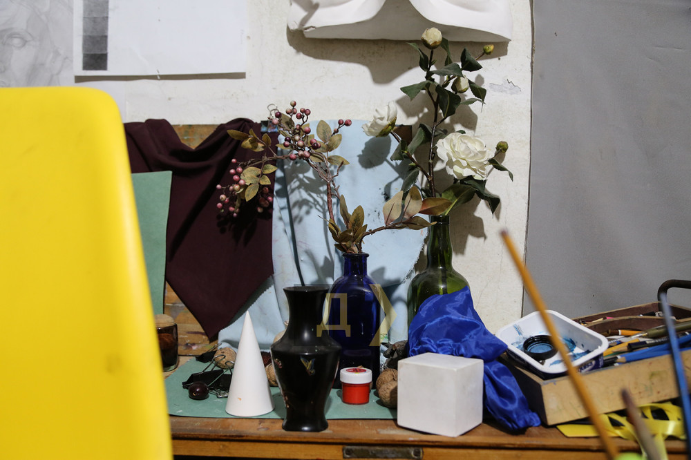 У майстерні тихо грає музика. Приходять учні, розсідають на свої місця, хтось закінчує ранні роботи. Початківці малюють куб. Більш просунуті — гіпси та простенький натюрморт. Одна дівчина закінчує копію картини Олександра Ройтбурда з великим помаранчевим гарбузом – вона побачила цю роботу в каталозі та вирішила повторити.