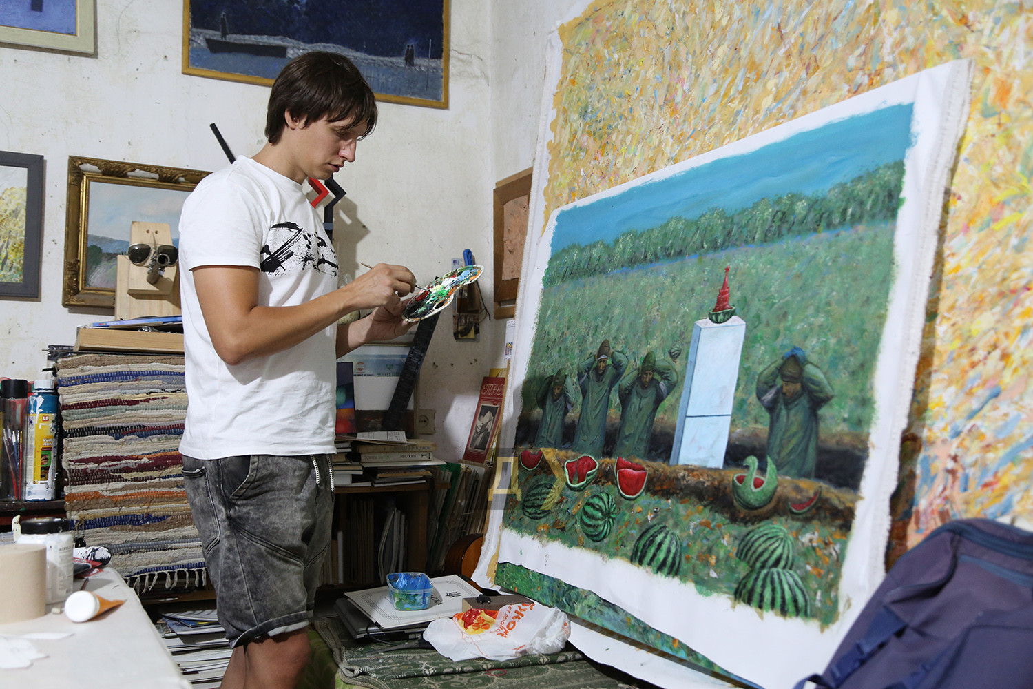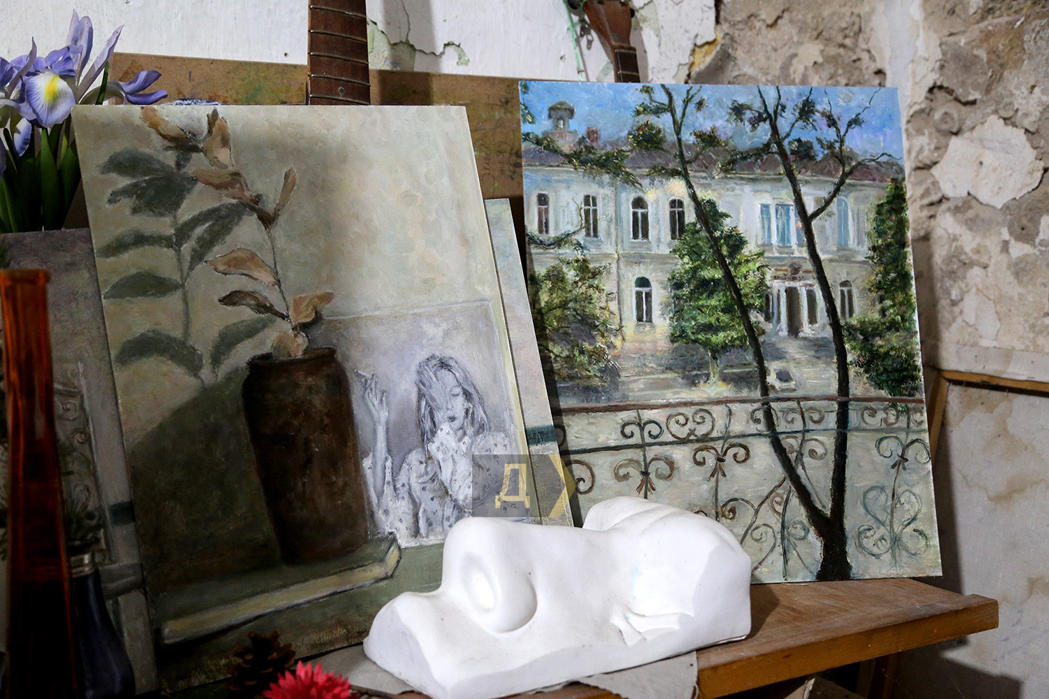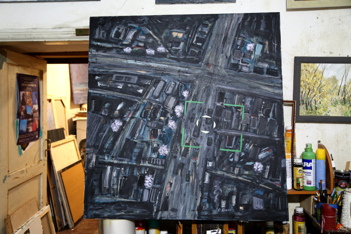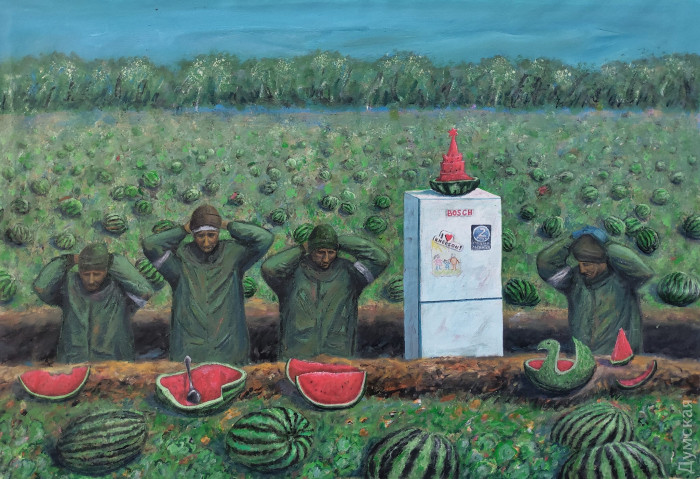 Пензликом та олією проти путіна: як в Одесі вчаться малювати і ховаються під час повітряних тривогМаленькі майстерні у напівпідвалі у самому центрі Одеси. Колись їх роздавали від Спілки художників, зараз усе тримається на чесному слові та за старою пам'яттю. Саме тут побувала кореспондент «Думської», щоби переконатися, що навіть під час війни творче життя у місті триває, незважаючи на повітряні тривоги. Тут знаходиться майстерня одразу двох одеських художників Ігоря Божка та його сина Сергія. Обидва — відомі автори, у кожного є свої шанувальники та шанувальниці. Ігор пережив Другу світову війну дитиною та добре її пам'ятає. Закінчив нашу Греківку ще в середині 1960-х, і вже тоді писав нонконформістські роботи та приймав активну участь у неформальних рухах. Пише вірші та талановиті картини, робить колажі та інсталяції. Частина робіт Ігоря Божка перебувають у його майстерні – вони надихають тих, хто приходить. Сергій – його син та учень. Після початку повномасштабного вторгнення повернувся до творчості в середині березня. «Пройшов перший шок і я зрозумів, що не можу не малювати — треба було висловитися хоч пензликом по полотну», — сміється Сергій. Одна з робіт молодого художника «Зацвіли вишні» — на полотні справді цвітуть дерева, але в об'єктив відеокамери безпілотника видно не лише їх, а зруйноване місто — розбиті будинки та знищена техніка ворога з літерами z та v. «Це була рефлексія на новини, на те, що відбувалося навколо. Перше усвідомлення — якого біса вони сунулися до нас, на нашу землю і полізли все руйнувати, красти та ґвалтувати», — розповідає Божко-молодший. А потім був один із прильотів до Одеси, і від ударної хвилі в картину «Дотримуйтесь спокою. Працює ППО» потрапили пензлики, пробили полотно і так там і залишилися. «Я написав про цей випадок на Фейсбуці і виклав фото. Спочатку хотів витягнути і залишити роботу з дірками — як символ війни. Мовляв, і картини зазнають поранень. Але потім вирішив, що нехай буде так, як трапилося, — ділиться художник. — А потім цю картину і купили. Соцмережі — найкращий маркетолог, зараз художникам не дуже солодко доводиться, адже потрібніше купувати дрони та тепловізори для наших захисників, а не живопис та графіку». На полотні «Перші підхерсоновики» — троє російських нацистів у окопі зі вкраденим холодильником та недоїденими кавунами. Цю картину Сергій закінчив незадовго до початку контрнаступу на півдні України. Автор поєднує майстерність живописця з тонкою іронією — це він прищеплює і своїм учням. «Взагалі-то школа-студія «Штрих» у нас працює ще з 2008 року, — розповідає Божко-молодший. — Ми одні з перших почали приймати учнів. Вчимо як академічному живопису, так і вільної творчості. Немає жодних догм, є бажання бачити і втілювати прекрасне — приходь і навчайся. Я взагалі проти догм, хоча й академізм у нас виходить непогано — після наших курсів усі вступали до вузів та до Греківки, жодних нещасних випадків не було. Усі задоволені та займаються творчістю». Студія відновила свою роботу теж з середини березня – двічі на тиждень, вечорами дівчатка та хлопчики, а також дорослі люди навчаються малюнку та живопису. Зараз немає фіксованої оплати – поклади у банку, скільки зможеш – тому що війна. «До мене прийшла родина з окупованого селища під Донецьком. Я говорю — я з вас грошей не візьму. 