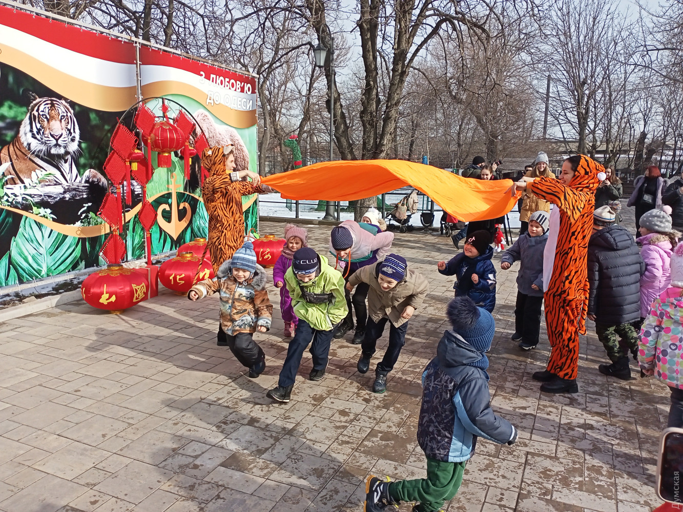 «Это не тигр, а тигрица!» — кричит в толпе кто-то наблюдательный. Все верно — это наша одесская амурская тигрица Тайге. Большой кошечке — большую коробочку. С Новым годом!