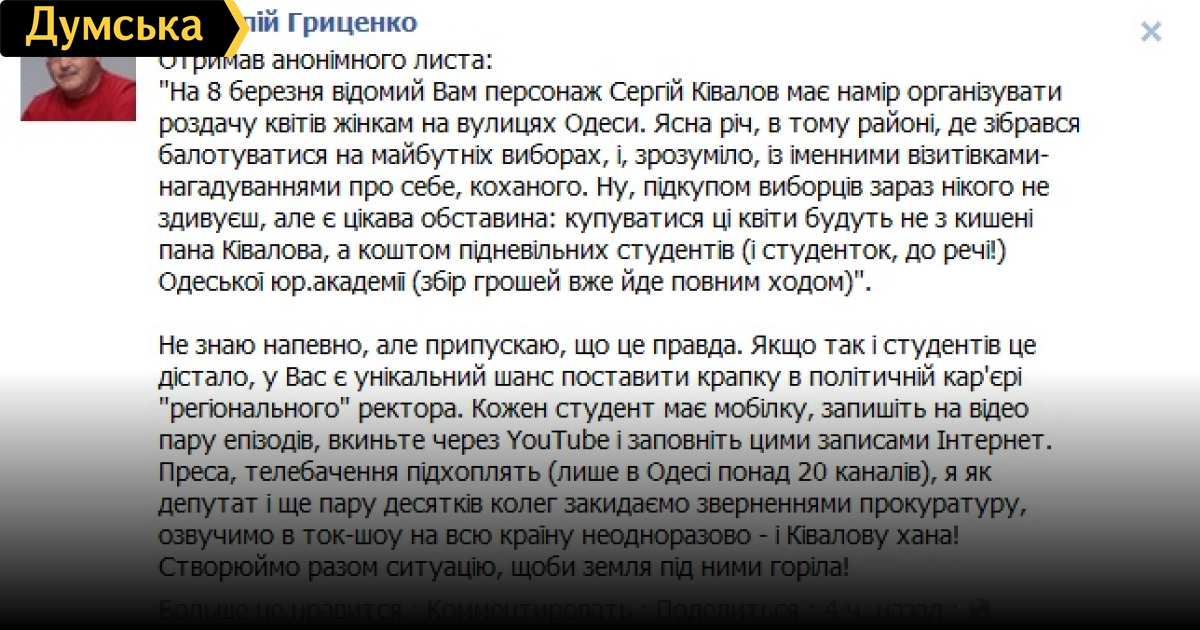 Анатолий Гриценко выложил в соцсети якобы пришедшую к нему анонимку, в которой «доброжелатель» сообщает политику о том, что Сергей Кивалов собирается 8-го марта раздавать цветы женщинам на улицах Одессы. По информации анонима, на цветы для этого мероприятия деньги собирают у студентов Национального университета «Одесская юридическая академия», президентом которой является Кивалов.