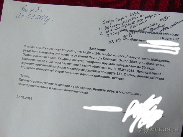 Окружная избирательная комиссия №137 (Котовск) зарегистрировала множество заявлений о нарушениях со стороны кандидата в депутаты Верховной Рады по данному округу Леонида Климова.