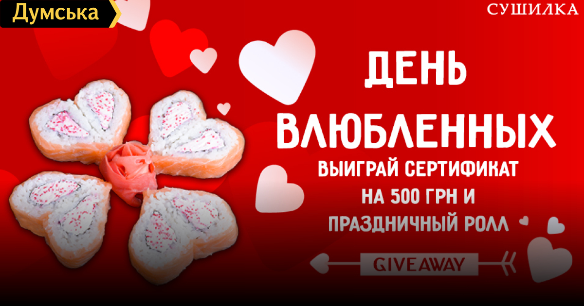Ко Дню влюбленных «Сушилка» разыгрывает сертификат и праздничный ролл (на правах рекламы)По случаю Дня влюбленных, который традиционно отмечается 14 февраля, служба доставки еды «Сушилка» объявляет о старте нового конкурса. Так, «Сушилка» разыграет сертификат и праздничный ролл «Филадельфия Love» среди подписчиков своей Instagram-страницы. Чтобы принять участие в конкурсе, необходимо подписаться на страницу доставки в Instagram, лайкнуть пост с розыгрышем, а также отметить в комментариях под данным постом двух друзей. Итоги конкурса будут подведены в прямом эфире 14 февраля в 22:00, после чего запись будет опубликована в соцсети. Кроме того, после 14 февраля «Сушилка» планирует расширить меню — будут добавлены новые роллы, пицца и WOK. А пока вы можете заказать любимое блюдо на сайте sushilka.od.ua или по телефонам: 073-240-0-140; 095-240-0-140; 096-240-0-140; 048-735-29-99.
