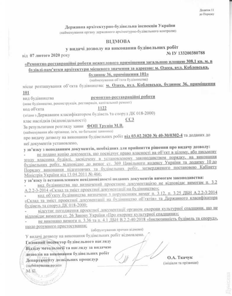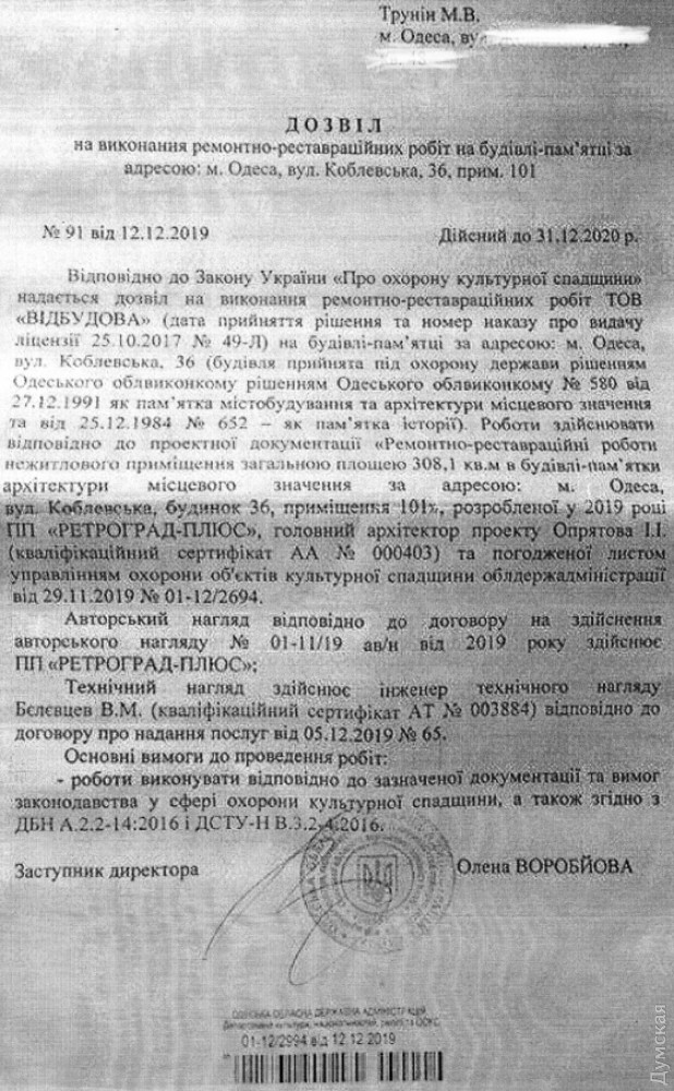 По нашим данным, в декабре 2019 года Трунин получил разрешение на ремонтно-реставрационные работы в помещении №101 (подрядчик — ООО «Відбудова», автор проектной документации ЧП «Ретроград-плюс»). Вместе с тем, ГАСИ Украины, которая выдает согласия на выполнение работ в памятниках архитектуры (класс последствий СС3), несколько раз отказывало заказчику уже в феврале 2020 года.