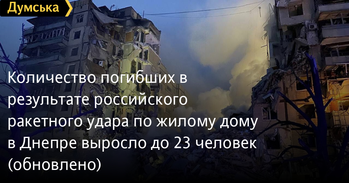 Кількість загиблих унаслідок російського ракетного удару по житловому будинку в Дніпрі зросла до 23 осіб (оновлено)18 жителів Дніпра, зокрема дитина, загинули внаслідок нацистського ракетного удару по житловій дев'ятиповерхівці в Дніпрі. Ще 73 людини постраждали, 40 із них госпіталізовано, повідомив голова Дніпропетровської обласної військової адміністрації Валентин Резніченко. Доля ще 40 мешканців будинку залишається невідомою. Розбір завалів і пошукові роботи тривають. Рятувальники вже розібрали 3500 тонн уламків. Ворожа ракета зруйнувала 72 квартири, ще понад 230 зазнали пошкоджень. На руїнах ще залишаються кілька осередків пожеж. ОНОВЛЕНО О 09:22. Кількість загиблих зросла до 20, повідомив Резніченко. ОНОВЛЕНО О 14:08. За даними Дніпровської міської ради, вже відомо про 23 загиблих. СМЕРТЬ РОСІЙСЬКИМ ОКУПАНТАМ! Помітили помилку? Виділяйте слова з помилкою та натискайте control-enter |