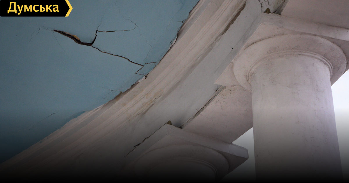 Как передает корреспондент «Думской», белоснежные колонны исписаны вандалами, а с потолка в любой момент может рухнуть огромный кусок штукатурки. Предупреждающая об опасности надпись едва заметна и выполнена мелом.