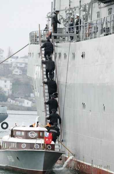 Руководство Черноморского флота России прибыло на борт корабля управления ВМС Украины «Славутич» для переговоров. На российском катере — флаг комфлота Александра Витко.