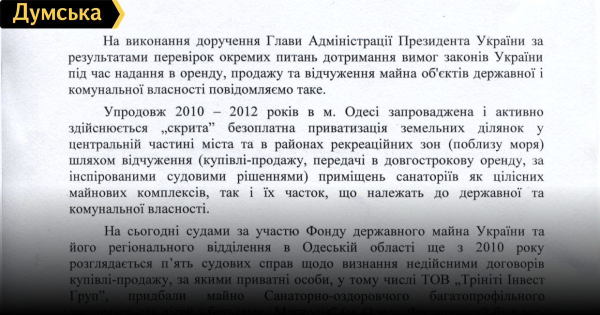 Чиновник обратил внимание Костусева на то, что в последние два года в Одессе активно реализуется схема скрытой бесплатной приватизации земельных участков в центральной части города и в рекреационной зоне. Землю отчуждают путем купли-продажи, передачи в аренду или по «инспирированным судебным решениям» (лексика документа). Речь идет, в частности, об одесских санаториях, прежде всего о «Магнолии», на имущество и землю которой претендует группа частных лиц.