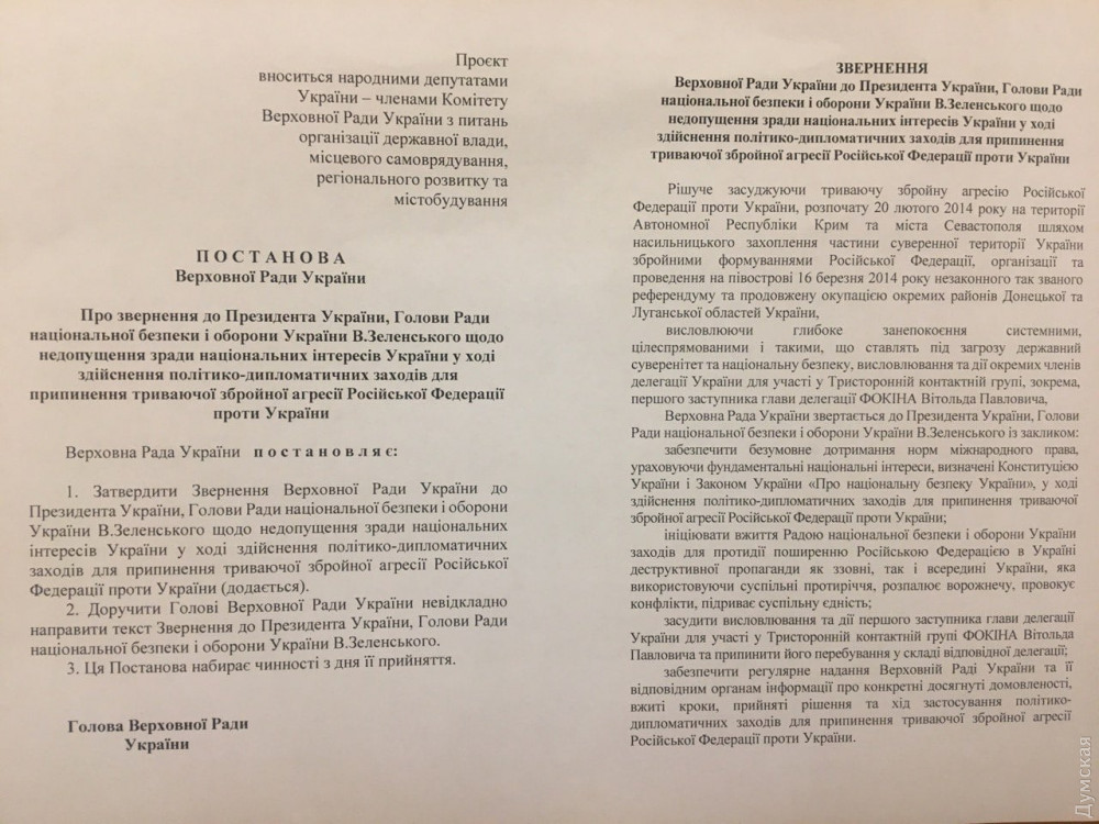 «Осудить высказывания и действия первого заместителя главы делегации Украины в ТКГ Витольда Фокина и прекратить его пребывания в составе соответствующей делегации», — говорится в обращении.
