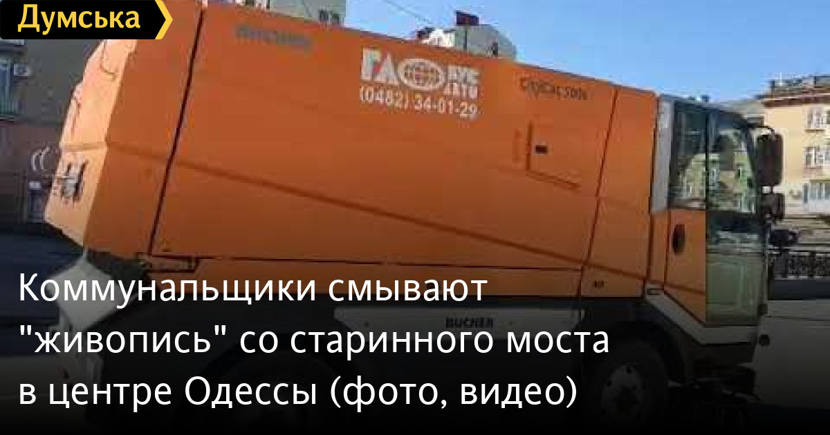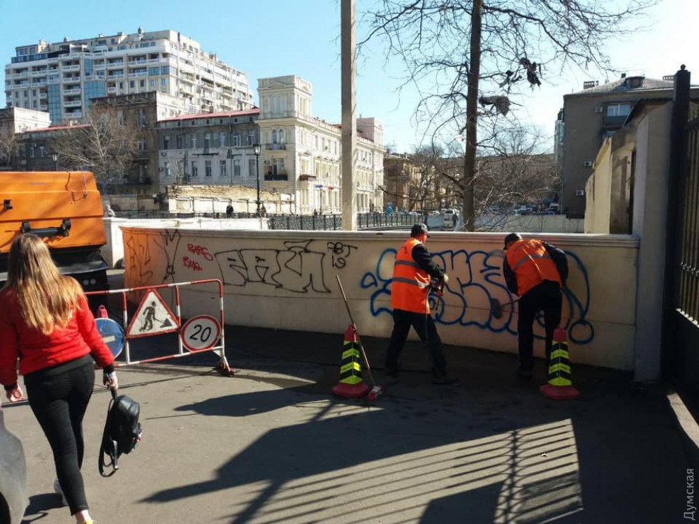 Сотрудники КП «Городские дороги» смывают «творчество» вандалов с моста Коцебу, что на улице Бунина.