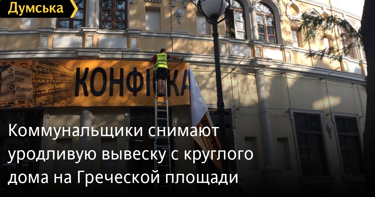 С фасада торгового центра «Афина» начали демонтировать огромную вывеску склада конфиската, появление которой возмутило горожан.