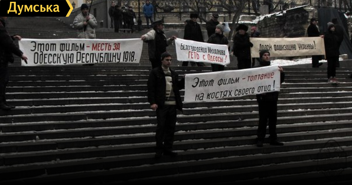 В руках левые держали плакаты «Этот фильм – топтание на костях своего отца», «Этот фильм – месть за Одесскую Советскую Республику» и «Белогвардейца Михалкова – геть с Одессы».