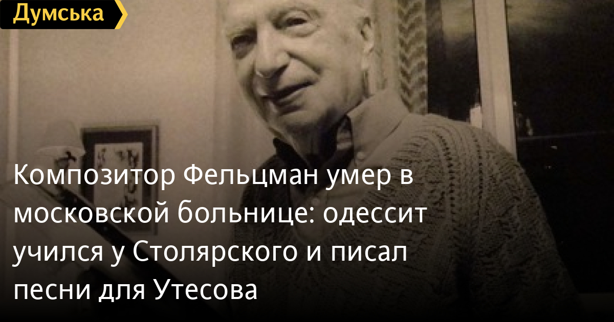 Композитор Фельцман умер в московской больнице: одессит учился у Столярского и писал песни для УтесоваВ московской центральной клинической больнице имени Семашко ночью 3 февраля скончался Оскар Фельцман. Он — последний из блестящей плеяды советских композиторов-песенников, один из самых знаменитых одесситов. До своего 92-летия Оскар Борисович не дожил всего две недели. О смерти композитора сообщил Иосиф Кобзон. «Он умер от сердечной недостаточности», – заявил певец. Гражданская супруга Фельцмана сообщения о смерти мужа сначала опровергла, но в конце концов подтвердила. «Еще вчера мне никто ничего не говорил, но сегодня выяснилось, что Оскар Борисович, действительно, умер в ночь на воскресенье. Он очень мучился», — приводит ее слова РИА «Новости». По словам женщины, композитор хотел, что бы его похоронили на Новодевичьем кладбище. Решение о месте проведения церемонии прощания и похорон будет принято сегодня. Для справки: Фельцман Оскар Борисович, автор популярных песен, симфонических и камерных произведений, музыкальных комедий, музыки к кинофильмам и спектаклям. Народный артист РСФСР. Родился в Одессе 18 февраля 1921 г. в семье хирурга. В пять лет начал заниматься музыкой — играл на скрипке. Первую фортепианную пьесу «Осень» сочинил в шесть лет. Учился в школе им. П.С. Столярского (и у самого Столярского), в Московской консерватории. Первую песню «Теплоход» сочинил во время войны для Леонида Утесова. После выхода фильма «Матрос с Кометы» (1956) популярность обрела песня «Черное море мое», которая считается «неформальным гимном» Черного моря. Всего сочинил более 300 песен, многие из которых обрели широкую известность: «Ландыши», «Белый свет», «Возвращение романса», «Я верю, друзья» и др. Фельцману принадлежит цикл песен об Одессе. Также он написал музыку к пьесе одесских авторов Голубенко, Сущенко и Хаита «Старые дома», которая шла во многих театрах СССР и СНГ. Автор сборника рассказов «Костюм от Фишмана и другое». Принимал участие в праздновании 200-летия Одессы (1994). С Оскаром Борисовичем судьба меня сводила дважды — в 1985 и 1994 гг. И хотя до того встречался со многими знаменитостями, но все равно казалось фантастикой видеть перед собою человека, сочинившего песни, которые вошли в мою жизнь с раннего детства («Ландыши», «Черное море мое» и т.п.). В прошлом году увидела свет «Морская энциклопедия Одессы», где была помещена моя статья об Фельцмане, а также микро-рассказ («капсула») об одной из его самых знаменитых песен, основанный на беседе с композитором. Как запрещали «Черное море…» Композитор Оскар Фельцман любит вспоминать, как удалось спасти от запрета песню «Черное море мое», написанную им для фильма «Матрос с «Кометы». Идея этой песни родилась у поэта Михаила Матусовского, которому пришли на ум две строчки: Самое синее в мире - Черное море мое Сам поэт посчитал их «ужасными», но композитор, урожденный одессит, знавший не понаслышке, каким бывает Черное море, подбодрил соавтора. Художественный совет принял фильм «на ура», причем особенно хвалили песни. Но в Комитете по кинематографии были иного мнения: это – «пошлятина». Через некоторое время состоялось заседание Коллегии Министерства культуры, где обсуждался вопрос о снятии фильма с репертуара, причем одним из аргументов было то, что главная песня картины не удалась, она оказалас