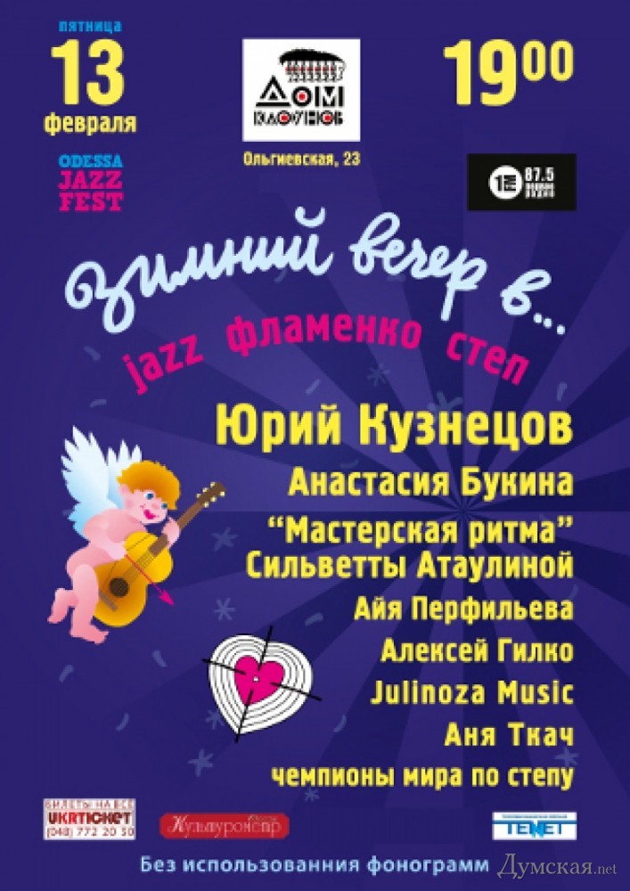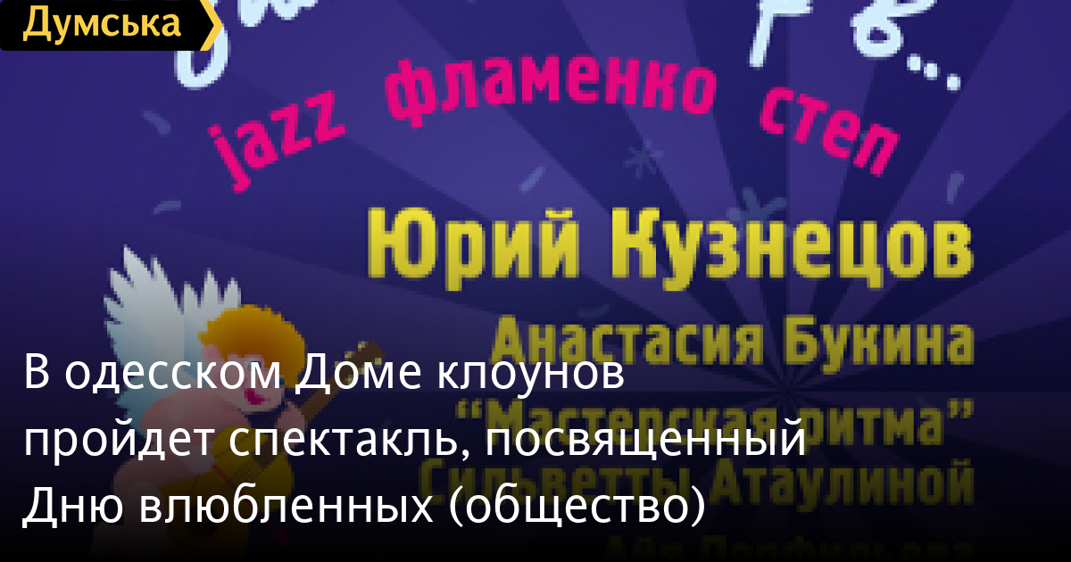В одесском Доме клоунов пройдет спектакль, посвященный Дню влюбленных (общество)В канун Дня всех влюбленных, 13 февраля, в Доме клоунов состоится праздничный спектакль под названием «Зимний вечер в…». В спектакле принимают участие как известные мастера, так и талантливая молодежь. Заслуженный деятель искусств Украины, пианист и композитор Юрий Кузнецов, мастер степа Алексей Гилко, певица Настя Букина, хореограф Айя Перфильева, группа Julinoza music и юное дарование Аня Ткач. «Любовь вечна, а День влюбленных всего один в году. В этот день люди хотят поделиться с миром лучшим, что есть в их сердце. У артистов это творчество и любовь. Наш спектакль называется «Зимний вечер в…» и наполнен музыкой, пластикой, танцем. Здесь присутствует тонкий намёк на легендарный фильм «Зимний вечер в Гаграх», где судьба человека, его музыка, танец и «весь этот джаз» слились воедино», комментирует будущее событие танцовщица и балетмейстер, руководительница студии степа и фламенко «Мастерская ритма» Сильветта Атаулина. «В этом музыкальном спектакле собраны и те, кто уже прославил Одессу и те, кто ее обязательно прославит», — заявляют организаторы. СМЕРТЬ РОССИЙСКИМ ОККУПАНТАМ! Заметили ошибку? Выделяйте слова с ошибкой и нажимайте control-enter |