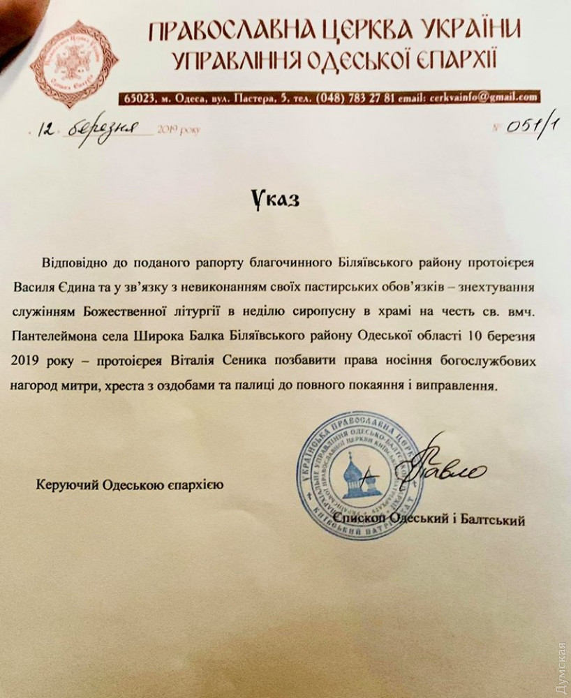 Священник Православной церкви Украины Виталий Сеник, конфликтующий с епископом Одесским и Балтским ПЦУ Павлом, написал заявление об увольнении. Об этом сообщили сторонники батюшки, который претендовал на должность настоятеля одесского кафедрального собора Рождества Христова, что на улице Пастера, и отказался признавать таковым своего епископа. Ранее Павел направил отца Виталия в распоряжение благочинного Беляевского района, назначив временно исполняющим обязанности настоятеля еще не построенного храма, а когда тот проигнорировал это распоряжение, лишил права носить богослужебные награды «до полного покаяния и исправления». Сегодня утром опальный батюшка лично принес архиерею прошение об отставке. Напомним, противостояние в соборе продолжается уже почти месяц. Сторонники Сеника обвиняют Павла в «узурпации канонической власти и злоупотреблении служебным положением», круглосуточно дежурят в храме, периодически вступая в перепалки с епископом, другими клириками и проукраинскими активистами, поддержавшими епархию. Они уверены, что имеют право избирать настоятеля и распоряжаться церковным имуществом. В епархиальном управлении действия оппонентов считают контрпродуктивными, провокационными и намекают, что за ними стоит «Оппозиционный блок»: сын Виталия Сеника является депутатом облсовета от этой политической силы. СМЕРТЬ РОСІЙСЬКИМ ОКУПАНТАМ! Помітили помилку? Виділяйте слова з помилкою та натискайте control-enter
