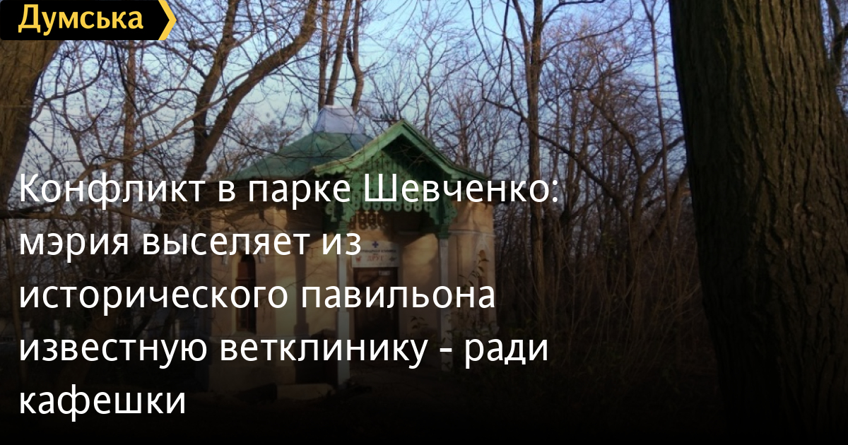 Муниципалитет выселяет из исторического павильона в парке Шевченко ветеринарную клинику «Друг», работающую там с 1991 года. Здание передадут другому арендатору — некоему предпринимателю, который хочет разместить у центральной аллеи парка кафе.