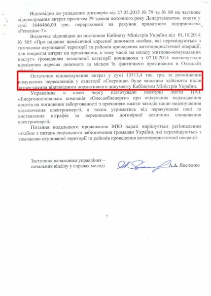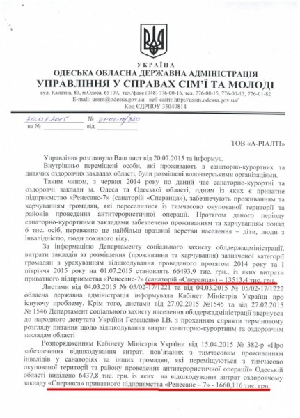 Только 27 мая 2015 года (через полгода после окончания договора аренды и за день до смены руководства областной администрации) предприятие «Ренессанс-7» подписало договор с ОГА и получило 1,6 миллиона гривен бюджетных средств за оказанные услуги по размещению беженцев. При этом представители ОГА даже не поинтересовались, есть ли действующий договор аренды, не запросили правоустанавливающие документы. По сути, они поверили на слово предпринимателю, который представлялся «администрацией санатория».