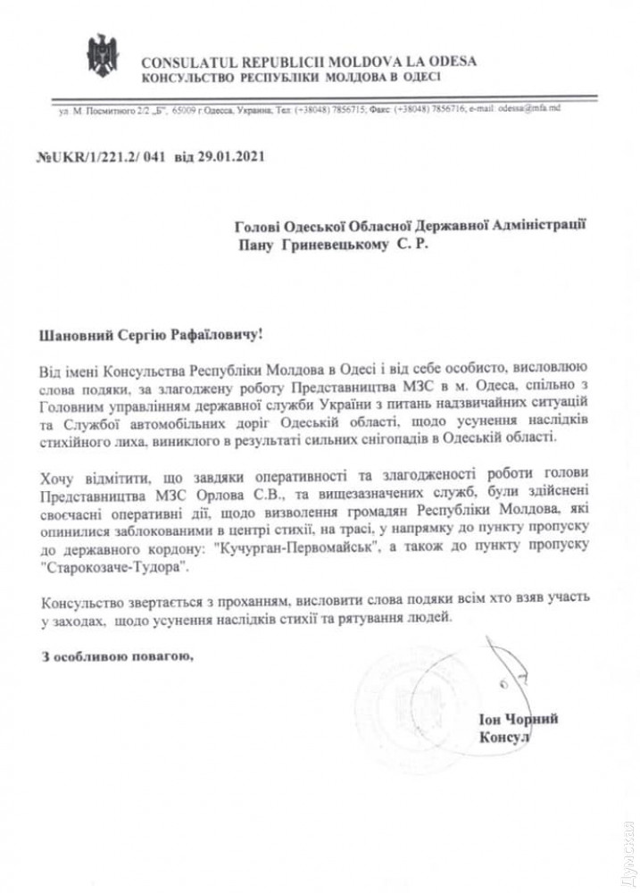 Консул Республики Молдова в Одессе Ион Черный направил главе Одесской областной госадминистрации Сергею Гриневецкому обращение с благодарностью в адрес представительства МИД в Одессе, а также сотрудников регионального управления ГСЧС и Службы автомобильных дорог.
