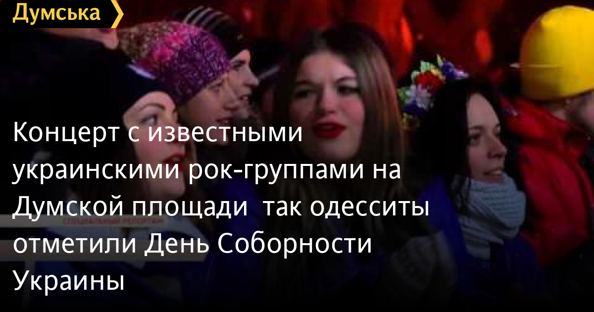 Концерт с известными украинскими рок-группами на Думской площади – так одесситы отметили День Соборности УкраиныКонцерт с известными украинскими рок-группами на Думской площади – так одесситы отметили День Соборности Украины. На сцене также выступили поэты и писатели. Украинский певец Сергей Файфура приехал из Киева, чтобы поздравить горожан. СМЕРТЬ РОССИЙСКИМ ОККУПАНТАМ! Заметили ошибку? Выделяйте слова с ошибкой и нажимайте control-enter Думская ТВ. Сюжеты: