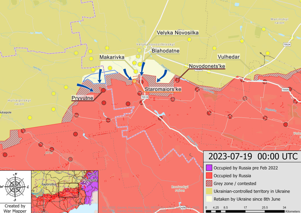 Друга ділянка розташована на схід, на адмінмежі між Запорізькою та Донецькою областями. Там захисники вийшли до північних околиць села Приютне, що біля Макарівки та Старомайорського, які були звільнені раніше.