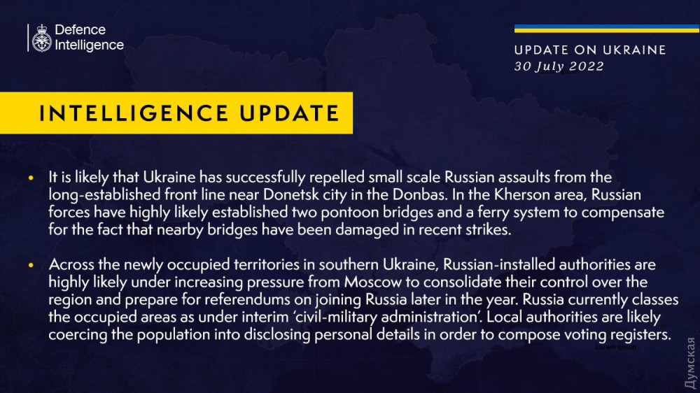 Щодо інших ділянок фронту, то британська розвідка зазначає, що Україна успішно відбила невеликі російські напади з давно встановленої лінії фронту поблизу Донецька.