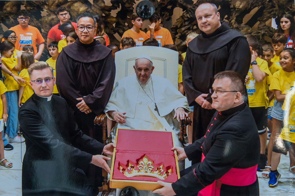 «Ця корона виготовлена з того, що принесли люди, — провадить далі отець Даниїл. – А люди приносили хто ланцюжки, хто персні, хто що хотів і міг подарувати для Богородиці, залишали біля ікони. З цих коштовностей і зроблено корону. Обряд коронації в церкві існує багато століть, його мета – ще більше показати людям, яка ікона є чудотворною. До цієї ікони люди приходять, просять про зцілення, про Божу благодать, тоді таку ікону можна коронувати. Щосереди папа римський приймає людей на генеральній аудієнції, де слухають його проповідь, просять про благословення чи про освячення різних предметів. І ми з цією короною підійшли до понтифіка, щоб він поблагословив її для одеської катедри».