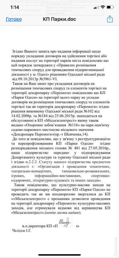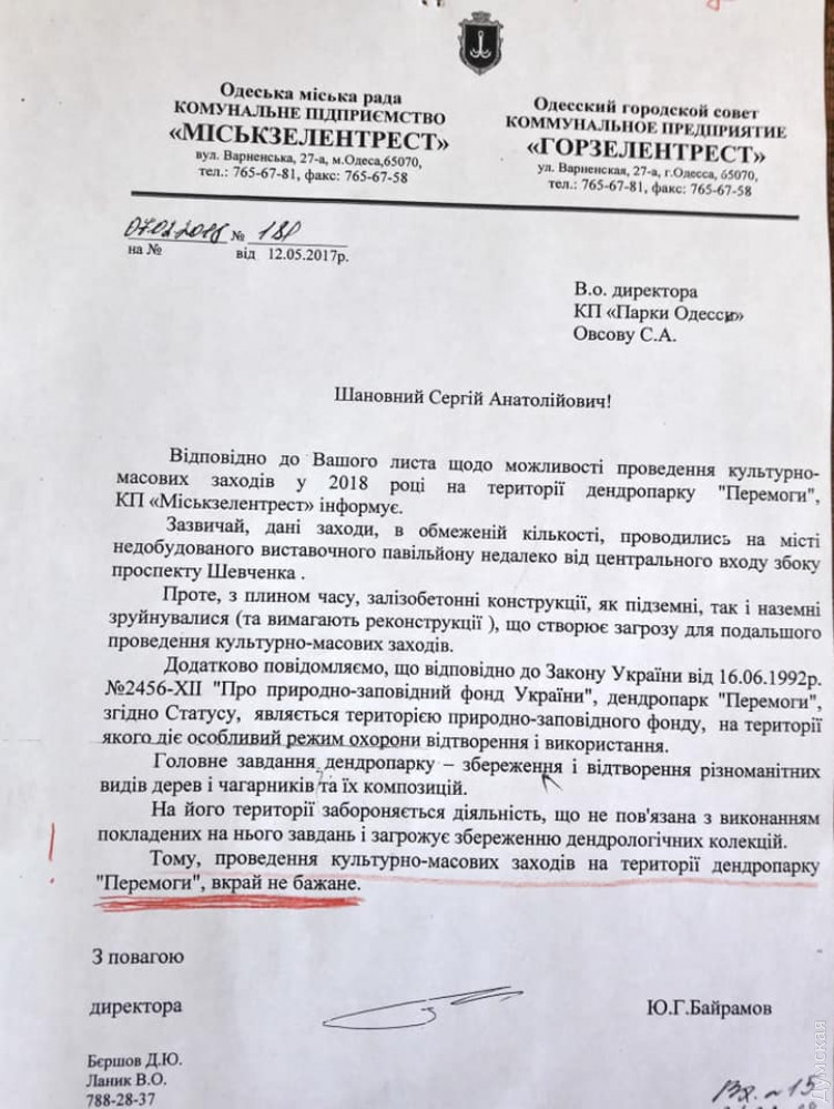 Общественник также опубликовал письмо директора «Горзелентреста» Юниса Байрамова, которое он написал еще в 2017 году тогдашнему руководителю «Парков Одессы» Сергею Овсову. В нем коммунальщик напоминает, что главной задачей дендропарка является сохранение и восстановление разнообразных видов деревьев и кустарников, поэтому проведение культурно-массовых мероприятий на его территории является крайне нежелательным. При этом мэрия и Приморская райадминистрация регулярно проводят в парке различные фестивали и другие массовые мероприятия.