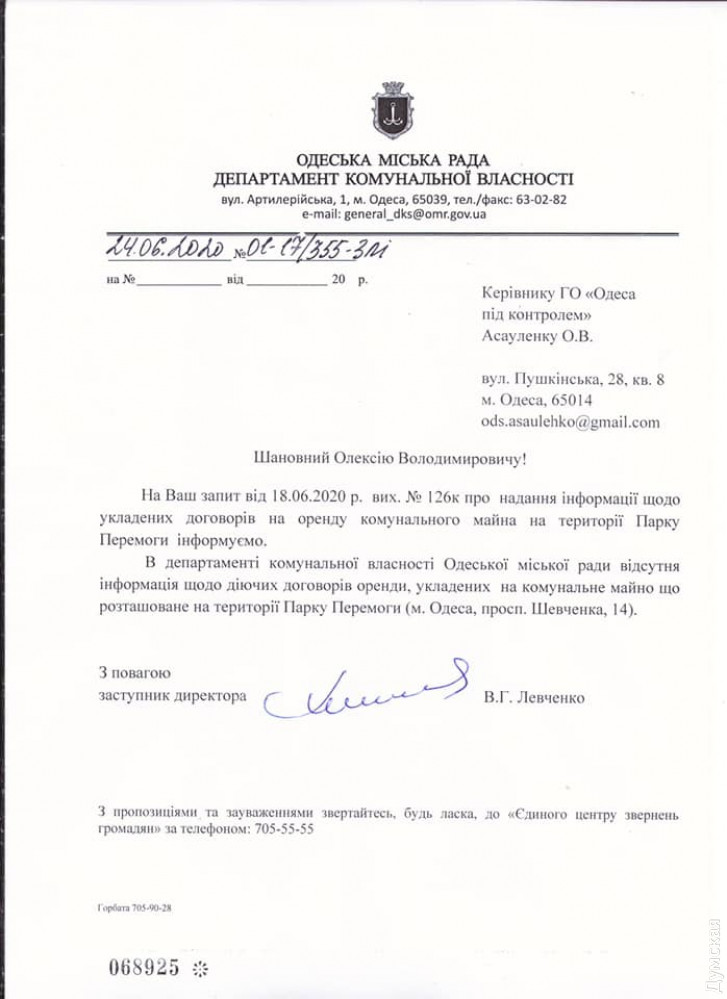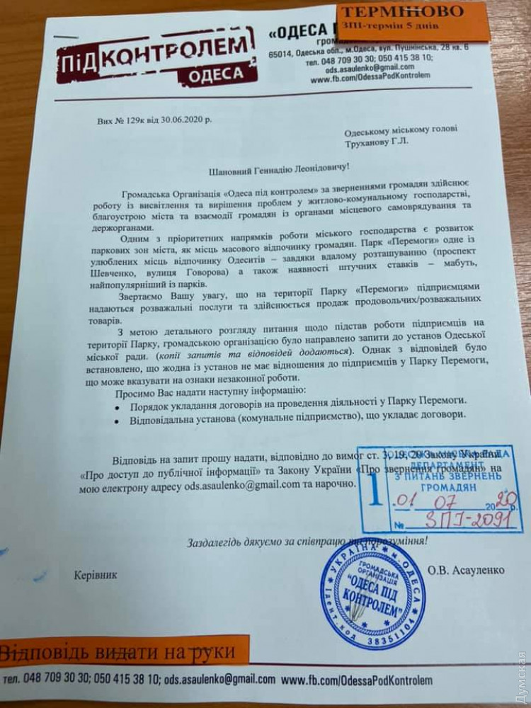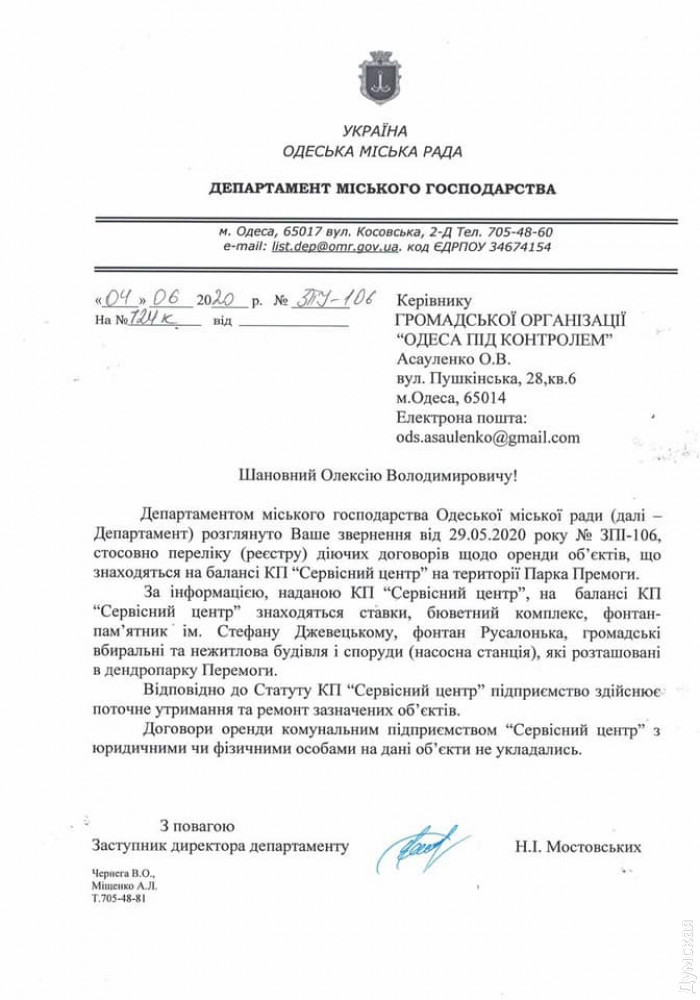 Асауленко направил запросы в департаменты городского хозяйства и коммунальной собственности горсовета, а также в коммунальные предприятия «Горзелентрест», «Сервисный центр» и «Парки Одессы». Выяснилось, что ни одна из этих организаций договоров с предпринимателями не заключала. Соответственно, если те что-то и платят, то вряд ли официально и точно не городу.
