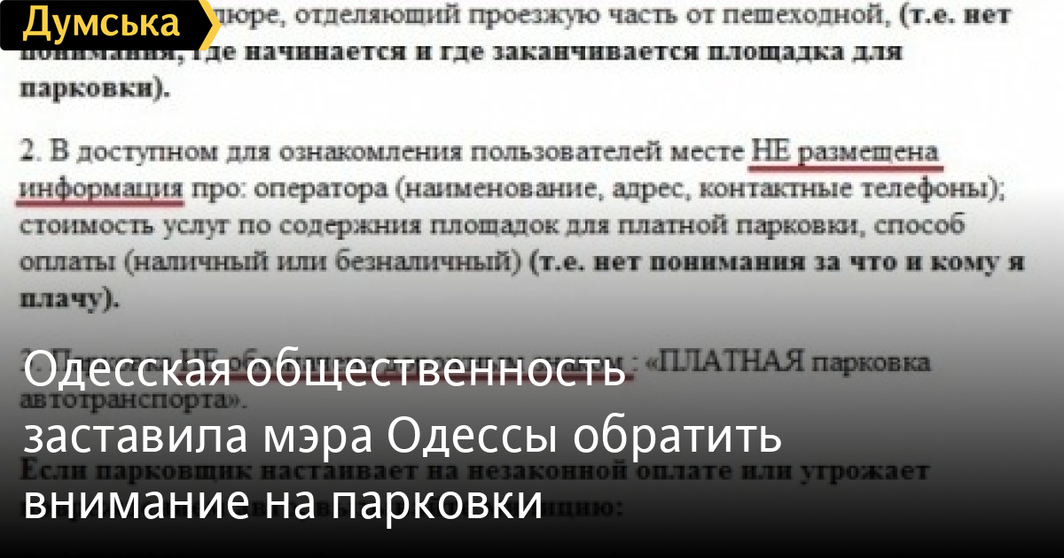 Отметим, что несколько недель назад активисты одесской организации «Общественный контроль дорог» (руководитель — Сергей Дубенко) начали масштабную акцию «Я НЕ плачу за незаконную парковку», которую в скором времени поддержало огромное количество одесских автомобилистов. Общественники, ссылаясь на постановление Кабинета министров и правила дорожного движения, убедительно доказали, почему все одесские парковки являются незаконными: