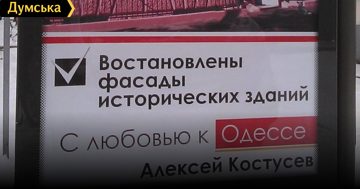 Восстановленный Азаровым на должность мэра, Костусев своим «фасадом» украсил рекламные щиты, где повествует как руками Тарпана, Климова и прочих лепит из Одессы конфетку под эгидой «покращення» и на зависть «попередныкам».