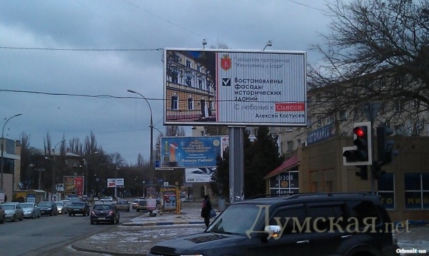 Восстановленный Азаровым на должность мэра, Костусев своим «фасадом» украсил рекламные щиты, где повествует как руками Тарпана, Климова и прочих лепит из Одессы конфетку под эгидой «покращення» и на зависть «попередныкам».