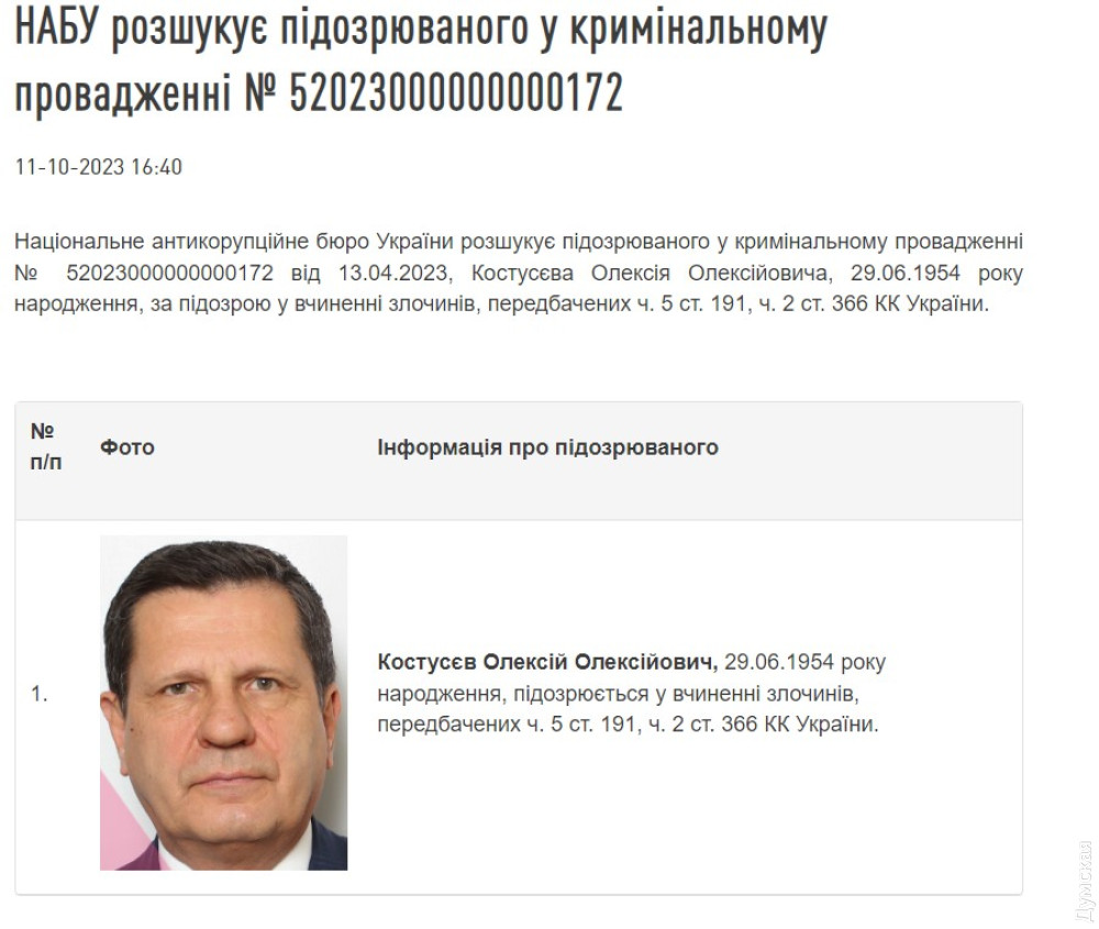 Костусєва, який з моменту своєї добровільно-примусової відставки перебуває за кордоном, розшукують у рамках кримінального провадження № 52023000000000172, відкритого за ознаками злочинів, передбачених частиною п'ятою ст. 191 і частиною другою ст. 366 КК України (розкрадання майна в особливо великому розмірі, вчинене організованою групою; і службове підроблення).