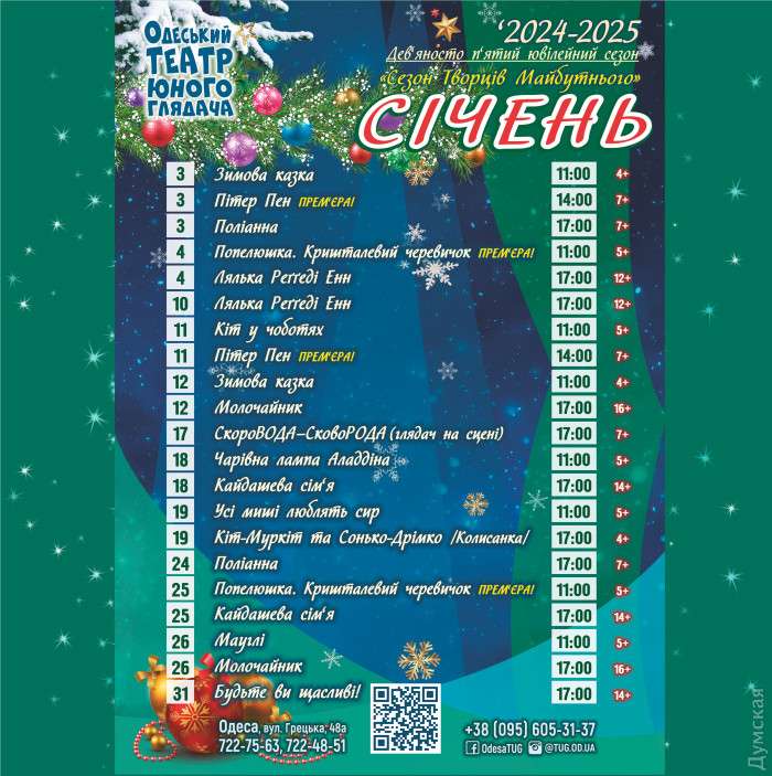 Улюблені постанови та яскраві прем`єри: Одеський театр юного глядача запрошує на вистави у січні (суспільство)Січневий репертуар Одеського театру юного глядача подарує гостям найкращі казкові вистави. В репертуарі січня – «Зимова казка», «Поліанна», «Кіт у чоботях», «Усі миші люблять сир!», «Чарівна лампа Аладдіна», «Лялька Реґґеді Енн», «Кайдашева сім’я», «Молочайник», «Будьте ви щасливі!». Також глядачів запрошують на прем’єрні вистави «Пітер Пен» і «Попелюшка. Кришталевий черевичок», і на виставу для маленьких глядачів – «Кіт-Муркіт та Сонько-Дрімко. Колисанка». Чекаємо на вас, друзі! Кожний глядач знайде в нашому театрі виставу по душі. Слідкуйте за анонсами! Квитки на вистави – тут. Помітили помилку? Виділяйте слова з помилкою та натискайте control-enter |