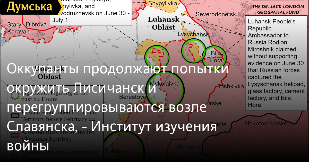 Оккупанты продолжают попытки окружить Лисичанск и перегруппировываются возле Славянска, — Институт изучения войныВойска российских оккупантов еще не достигли автомагистрали T1302 Бахмут-Лисичанск по земле, но мешают украинским силам использовать ее, нанося артиллерийские и авиаудары по оставшимся украинским позициям вдоль дороги. Как сообщают аналитики Института изучения войны, за прошедшие сутки основные усилия захватчиков были направлены на создание так называемого котла между временно оккупированным Изюмом в Харьковской области и Донецкой и Луганской областями. Российские войска продолжали попытки окружить последний крупный город в Луганской области — Лисичанск и вели наступательные действия южнее и юго-западнее города. Кроме того, оккупанты сосредоточились на перегруппировке и улучшении своих тактических позиций к северу от Славянска. Российские силы не проводили подтвержденных наземных атак на севере Харьковской области и продолжали обстреливать украинские позиции к северу от Харькова. СМЕРТЬ РОСІЙСЬКИМ ОКУПАНТАМ! Помітили помилку? Виділяйте слова з помилкою та натискайте control-enter |