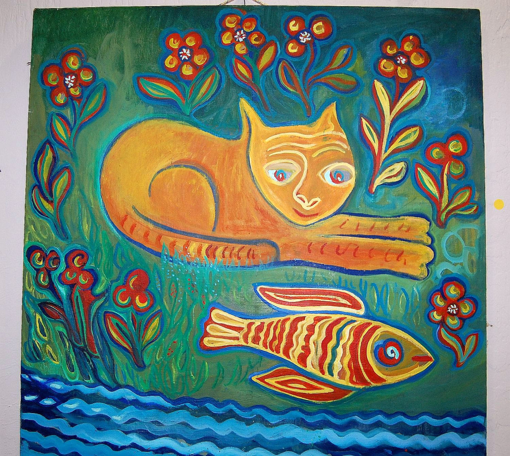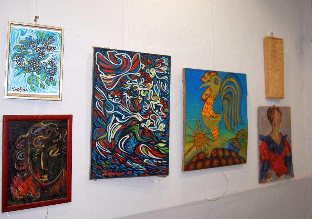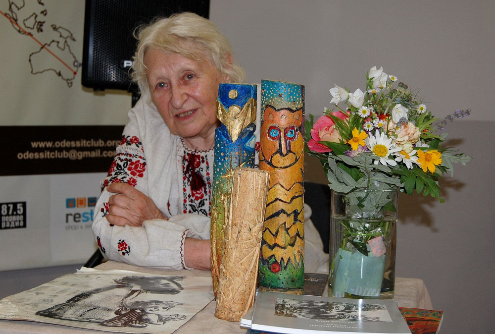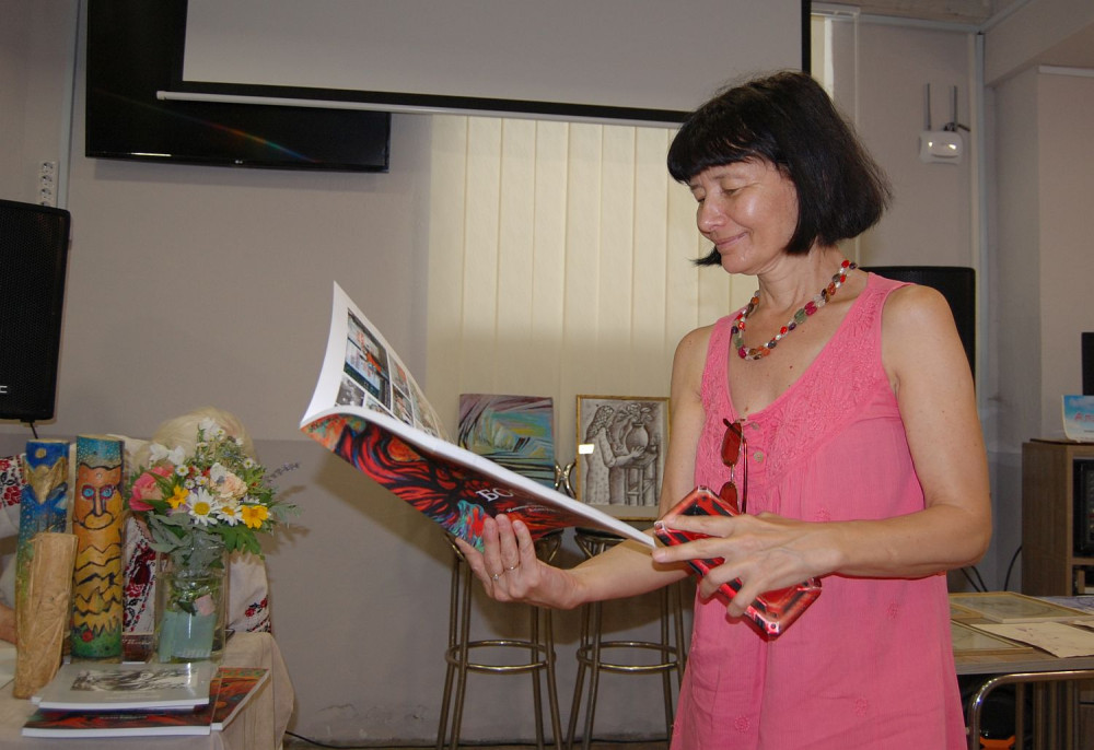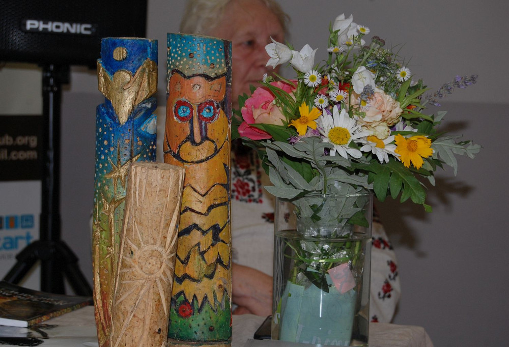 Представляя героиню вечера, директор клуба Григорий Барац и литературовед Алена Яворская сказали немало теплых слов. А еще оказалось, что Алла Крикун расписывает чурбачки из высушенных стволов новогодних елок. И получается совершено особый интерьерный арт-объект, не занимающий много места, зато согревающий душу. На одном из таких произведений красуется голубоглазый котик, к котикам у художницы особенная слабость, и как бы ни было тяжело материально лично ей, кормит и своих, и чужих животных.