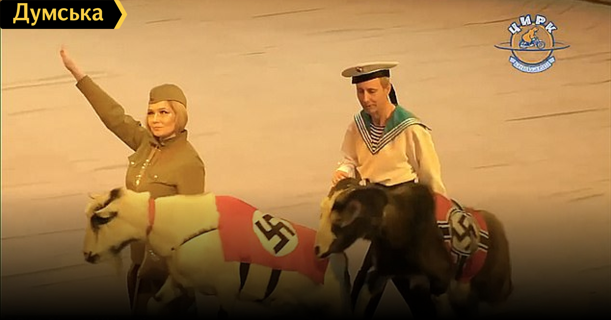 На днях в социальных сетях появилось видео выступления в цирке российского города Ижевск: на нем атлеты в пилотках и галифе подбрасывают гири, а дрессировщики в форме красной армии времен Второй мировой войны выводят на арену обезьяну в нацистской форме и козлов со свастиками на попонах и зигуют зрителям.