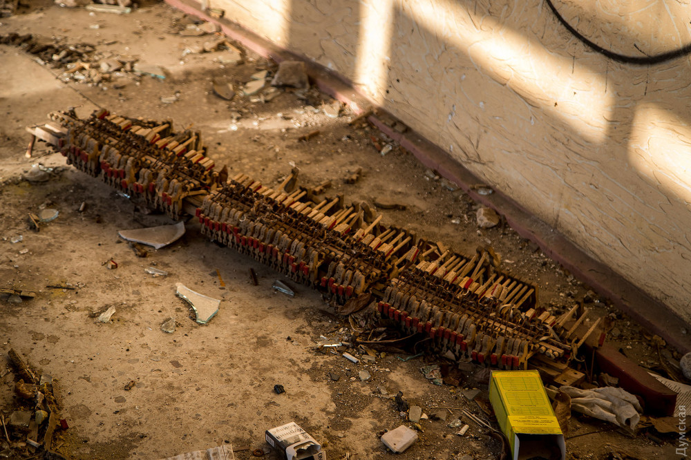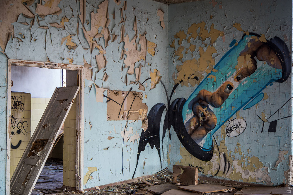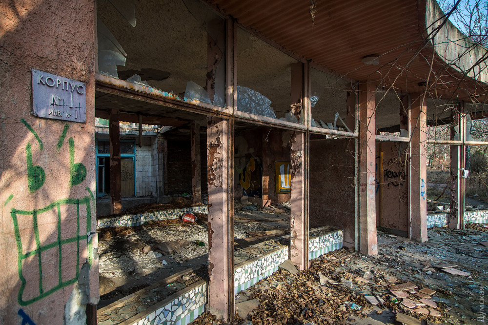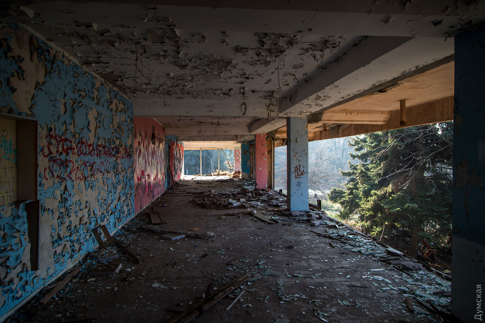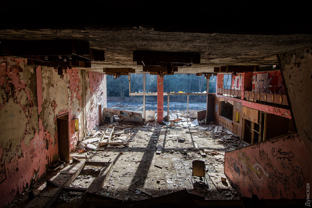 Огромное здание клуба-столовой сохранилось намного хуже, чем спальные корпуса. Находиться там опасно для жизни: часть стен обрушилась, с потолка свисают увесистые куски бетона.