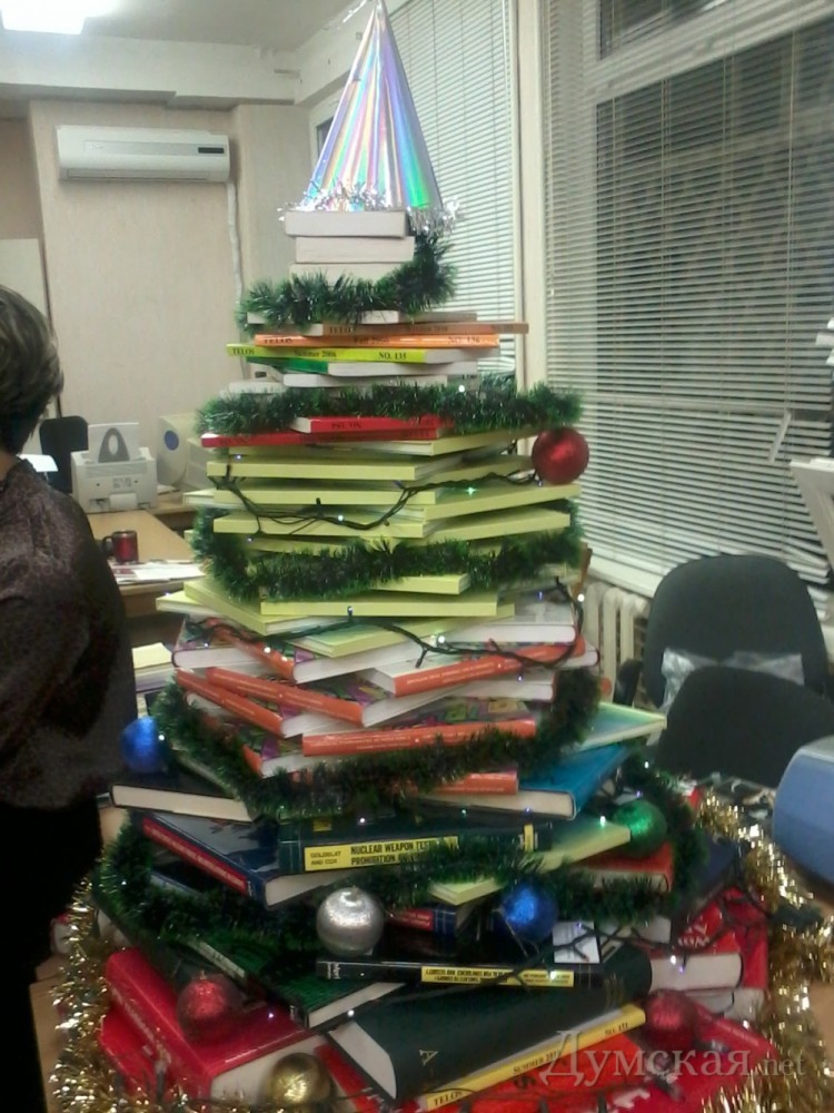 В социальных сетях появились фотографии необычных елок, которые сотворили студенты и преподаватели некоторых одесских вузов. Так, в медицинском университете новогодний атрибут соорудили из… одноразовых хирургических перчаток. А на кафедре международных отношений национального университета им. Мечникова елку сделали из научной литературы. В частности, в основании зеленой красавицы находится какая-то книга, посвященная оружию массового поражения.