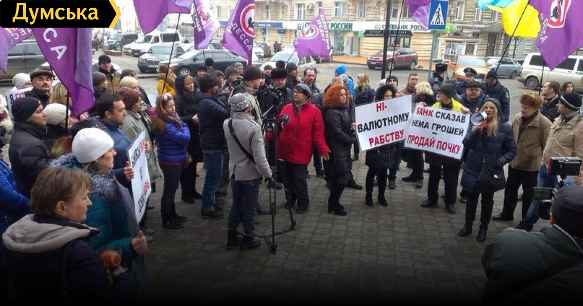 По словам участников акции, все они - кредитные заемщики, которым после стремительного падения гривны не под силу выплачивать кредиты.