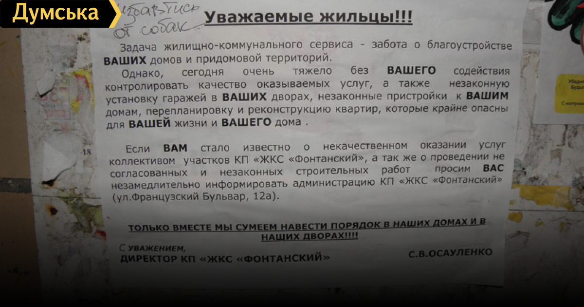 Одесский ЖКС решил попросить помощи одесситов в своем нелегком труде. Вот такие листовки с просьбой о содействии ЖКСу дворники на днях расклеили в подъездах домов, которые обслуживает ЖКС «Фонтанский» (директор — депутат горсовета от ПР Светлана Осауленко).
