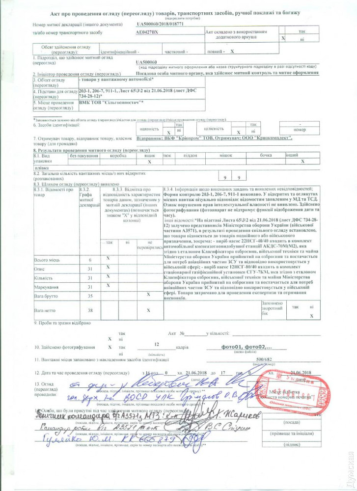 Итак, что произошло. 21 июня 2018 года сотрудники СБУ задержали на территории таможенного поста «Одесса-Порт» (Новомосковская дорога, 23) автомобиль с контейнером. Согласно предъявленным документам, отправителем груза было одесское ООО «ПКФ «Криопром», а получателем — российское ООО «Криокомплект».