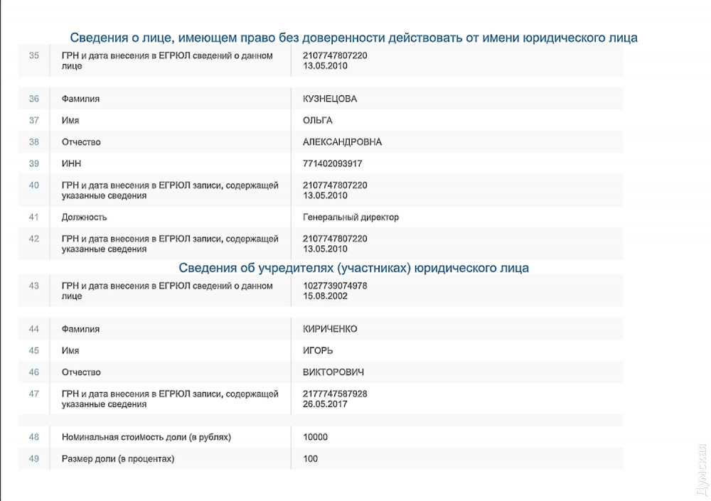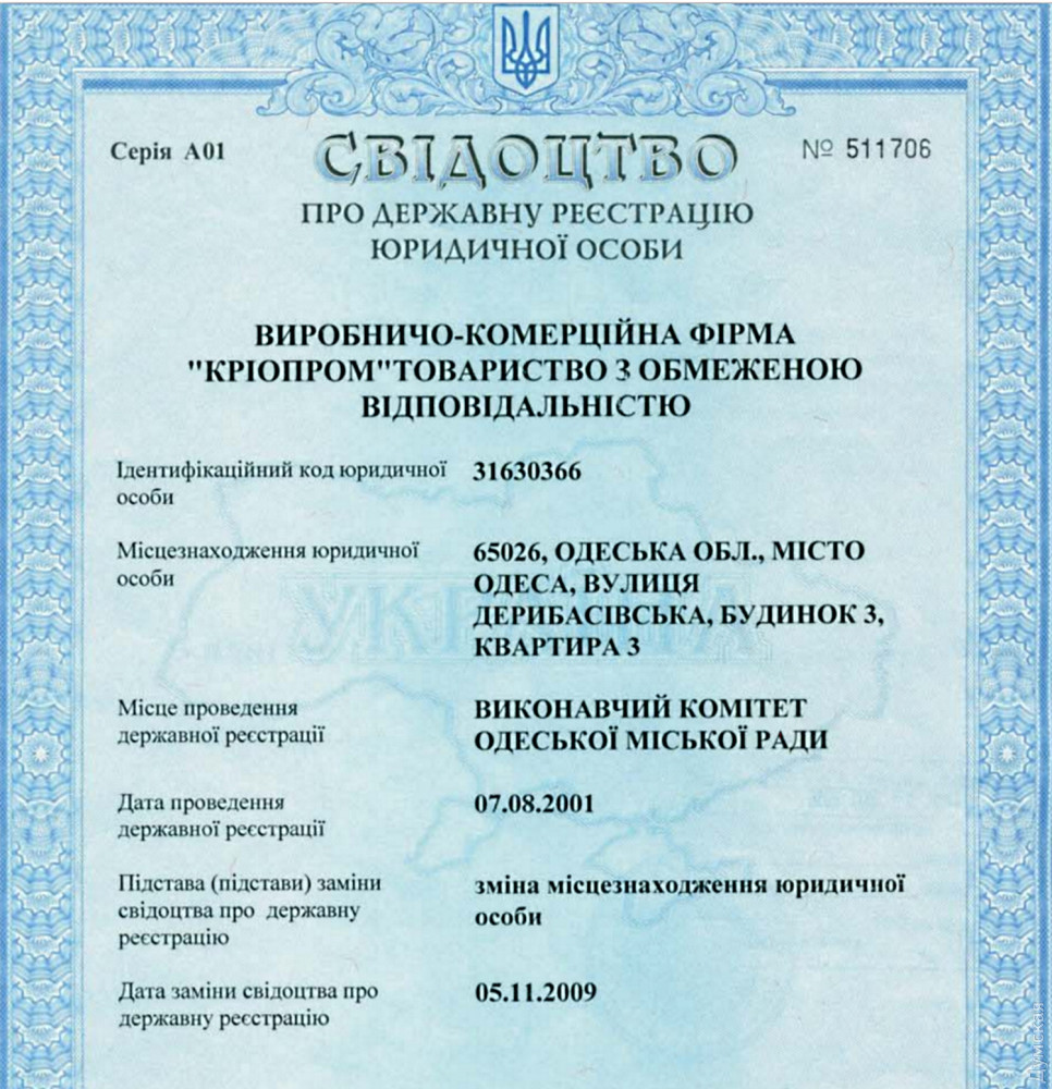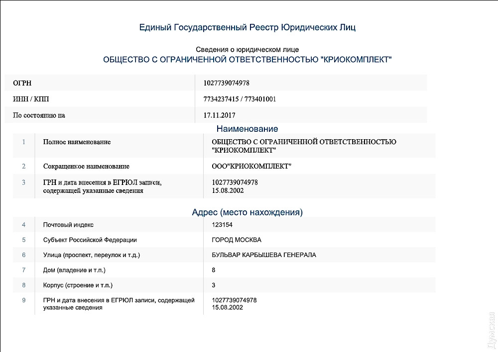ООО «ПКФ «Криопром» зарегистрировано по адресу Дерибасовская улица, 3, кв. 3. Владелец компании — житель Одессы Кириченко Игорь Викторович. Он же является учредителем и фирмы-получателя груза, ООО «Криокомплект», зарегистрированной в Москве по адресу бульвар Генерала Карбышева, 8/3. Последняя состоит в договорных отношениях с рядом предприятий российской оборонки.