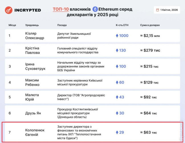Топ-7 по крипте, бизнес на 400 млн и стипендия в Нархозе: одесский коммунальщик уволился с олигархической декларациейВ топ-7 владельцев Ethereum в Украине вошел уже бывший заместитель директора по финансовым и экономическим вопросам КП «Теплоснабжение города Одессы» Евгений Колопенюк. Перед увольнением он подал декларацию о доходах, которая напоминает отчет успешного олигарха, а не скромного муниципального служащего. Согласно документу, общая стоимость криптопортфеля чиновника превышает 7 млн грн. Основной упор сделан на вторую по капитализации мировую валюту: Колопенюк задекларировал 29,66 ETH, что по текущим меркам оценивается почти в 3,3 млн грн. Кроме того, в цифровых активах чиновника значатся 0,18 Bitcoin (стоимостью около 683 тыс. грн), 50 тыс. USDT (более 2,1 млн грн), и 24,5 тыс. USDC (еще 1 млн грн). В сентябре 2025 года Колопенюк также приобрел 50 государственных облигаций Украины общей стоимостью 206 тыс. грн. Семья держит наличными 150 тыс. долларов и 50 тыс. евро, а на банковских счетах скопила более 1,3 млн грн, 84 тыс. евро и 64 тыс. долларов. На фоне этих цифровых богатств его официальная зарплата в КП (84,3 тыс. грн) и студенческая стипендия в одесском Нархозе в 8,7 тыс. грн выглядят как статистическая погрешность. Помимо криптобирж, Колопенюк активно осваивал рынок недвижимости. У него есть дом в Одессе на 250 кв. м и участок на 470 кв. м, квартира в Новой Долине (40 кв. м), а также почти 1000 кв. м земли в Таировской ОТГ и еще 2,8 га в Херсонской области. Супруга чиновника не отстает: в разгар полномасштабной войны, летом 2023 года, она приобрела особняк в поселке Лиманка площадью 375 кв. м за 12,6 млн грн. В ее активе также квартира на 100 квадратов в Овидиопольской ОТГ, нежилое помещение в Одессе, три земельных участка (включая два на Закарпатье общей площадью 3200 кв. м) и арендованная квартира в Чехии. Передвигается семья на минивэне Mercedes-Benz V250 2019 года выпуска и микроавтобусе Volkswagen Transporter 201-го. При этом в прошлом году чета продал три автомобиля: старенькие Toyota Land cruiser 200 и Corolla, а также и Mitsubishi Colt. Работа в коммунальном секторе явно не мешала Евгению Колопенюку строить масштабный частный бизнес. Стоимость его активов в различных предприятиях исчисляется сотнями миллионов гривен. В ООО «Одесское дорожно-строительное управление» ему принадлежит 92,71% акций стоимостью 100,5 млн грн. В ООО «Энко Энтерпрайз» он владеет 50% на сумму 271,8 млн грн. Еще по 100% акций чиновник удерживает в ООО «ОПМК» и «ЧТБ» (35,6 млн грн), а также 98% в ПКФ «Одесспецмонтаж» (9,31 млн грн). Дополнительно он имеет доли в ЧП «Нейчур Узбережжя», ООО «Одесса-Краз-Сервис» и «Украктиввугілля». Как выяснила «Думская», Хаджибейский районный суд рассматривает дело о масштабном уклонении от налогов компаниями Колопенюка — «Энко Энтерпрайз» и «ШБУ». Следствие установило схему с «бестоварными операциями» через десятки подконтрольных фирм. Только по предварительным данным, бюджет недополучил около 12 млн грн налога на прибыль. Попытки уберечь бизнес от внимания БЭБ превратились в настоящий криминальный перформанс. Когда детективы в октябре 2024 года запросили финансовые документы, компании ответили лишь через три месяца, заявив, что оригиналы были украдены из машины главбуха 7 января прошлого года. При этом бухгалтер даже не настаивала на возбуждении уголовного дела, что силовики расценили как инсценировку для сокрытия улик. В январе 